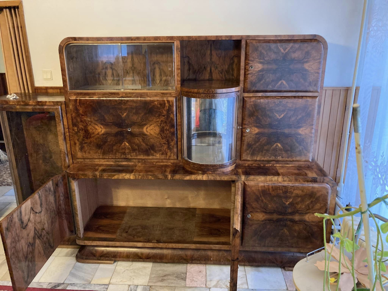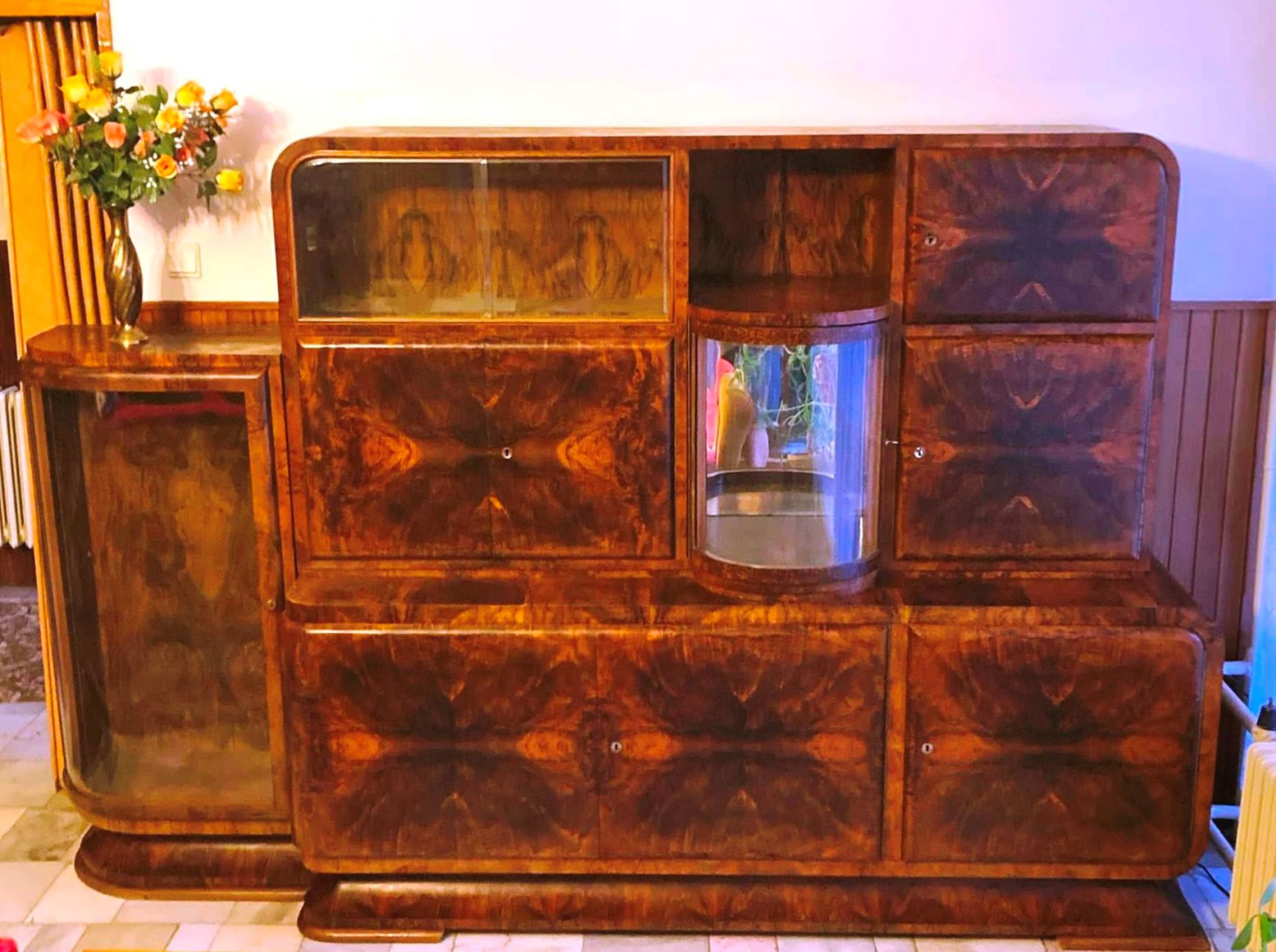 Art Deco sekretár / kabinet s barom a vysúvacím písacím stolom. Všetko s jedinečnou orechovou dýhou.