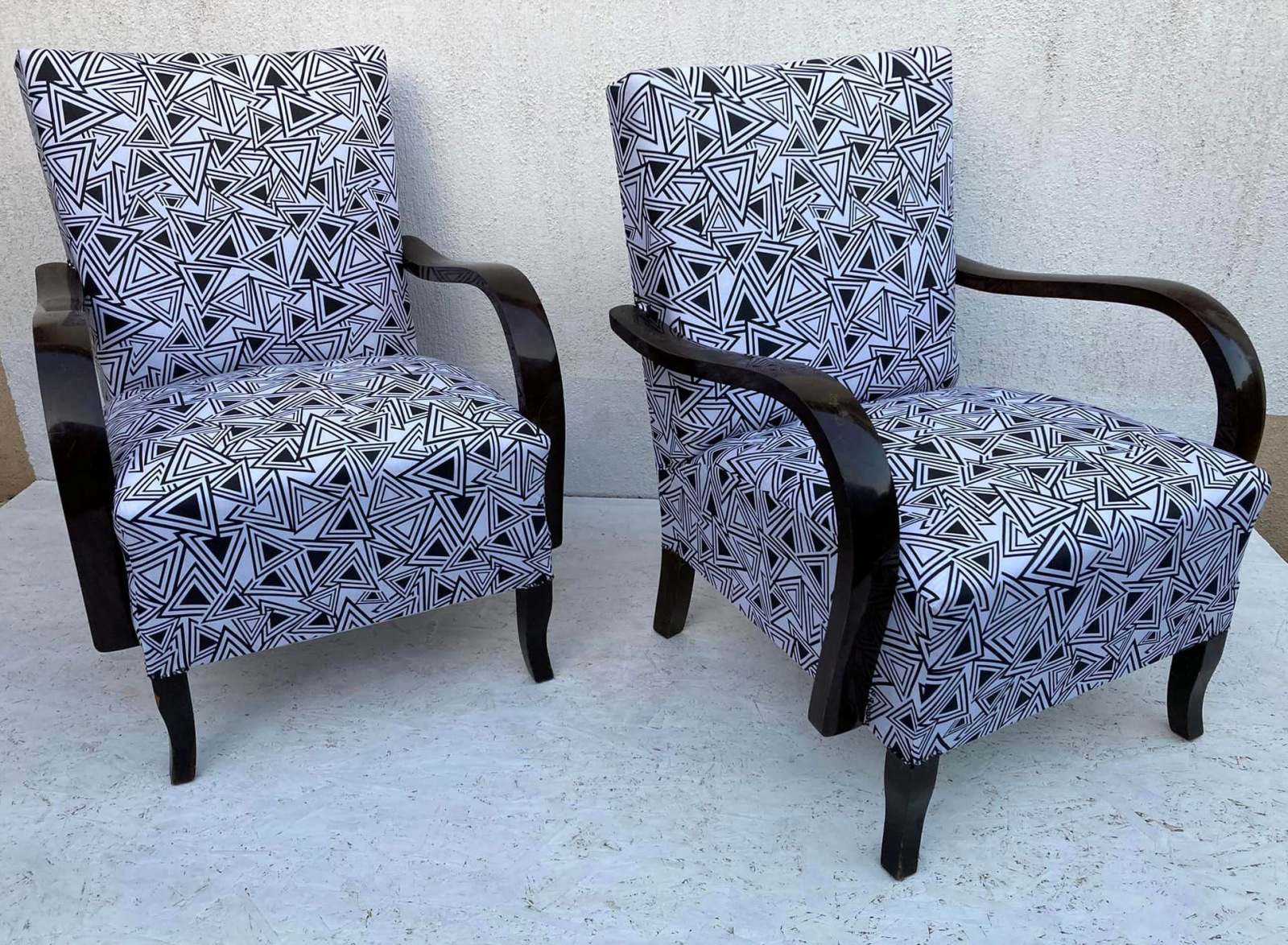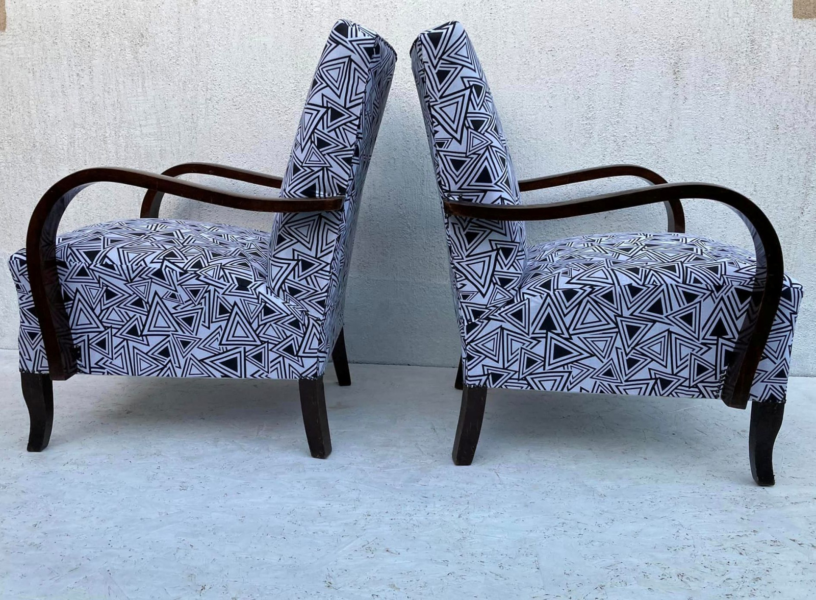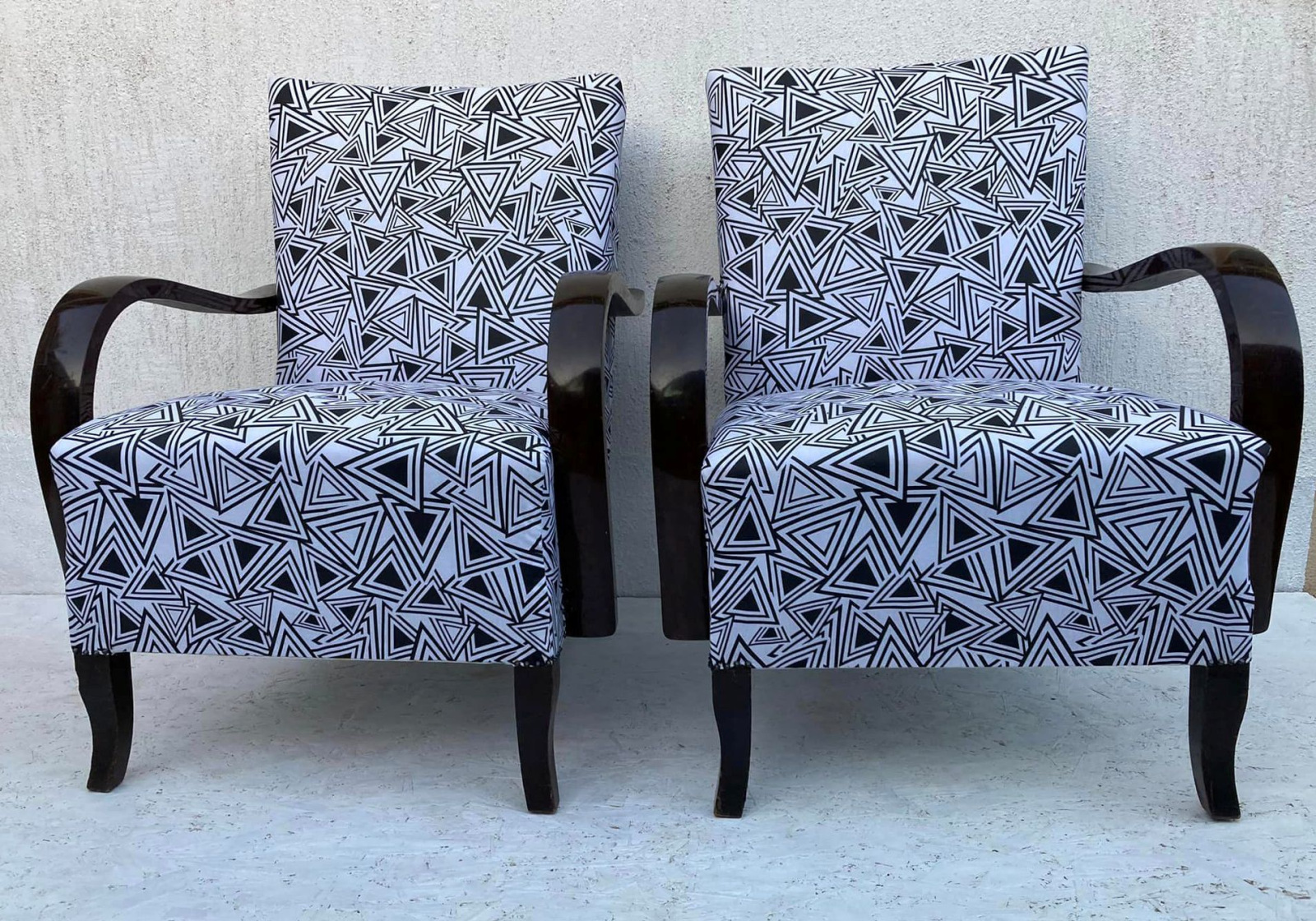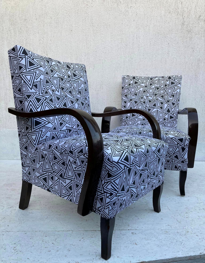F094 - Art DECO kreslá komplet zreštaurované s novou látkou s abstraktnými tvarmi typickými pre art DECO. Niekomu sa môžu páčiť, niekomu nie. 100% stav.
