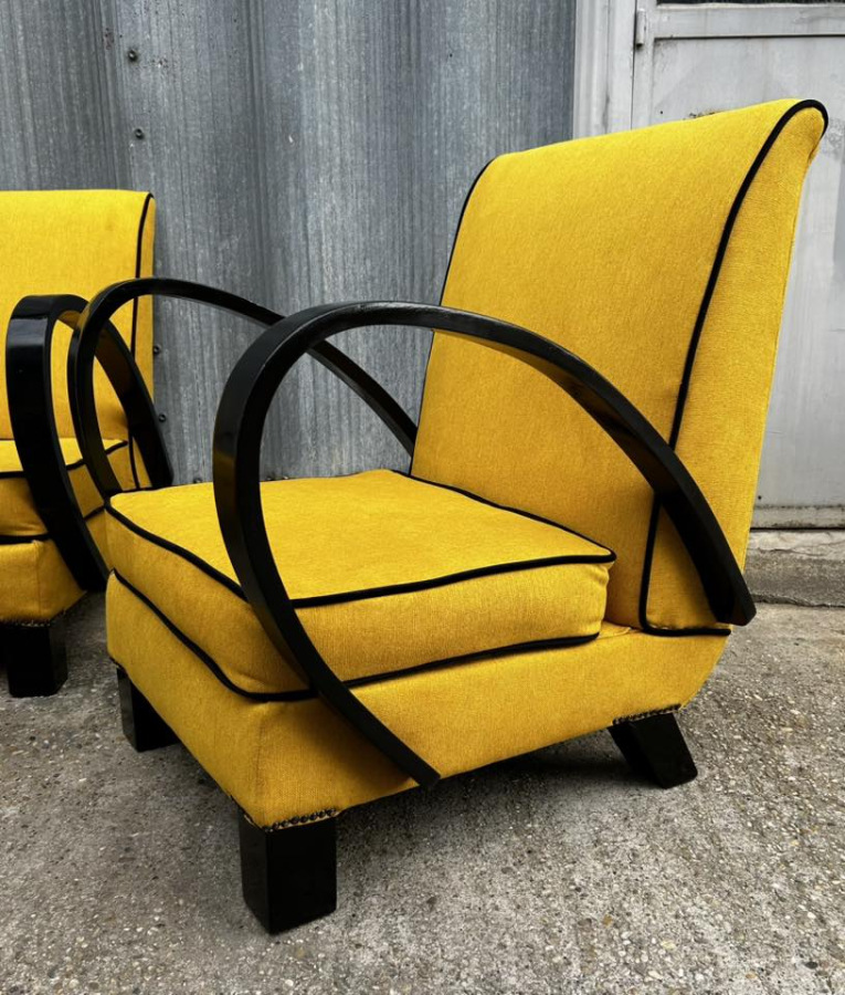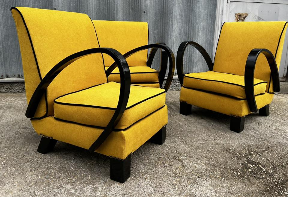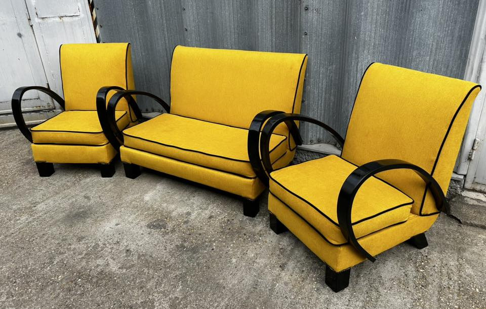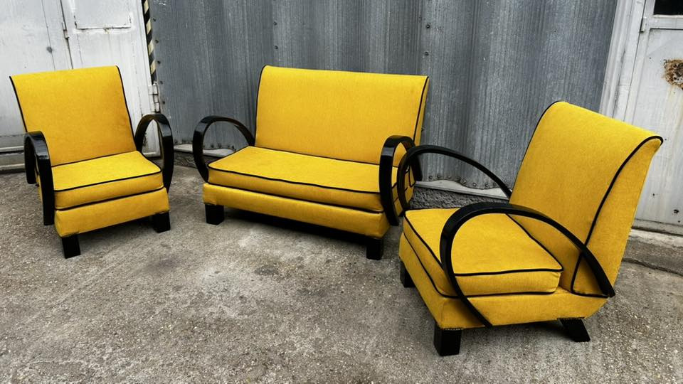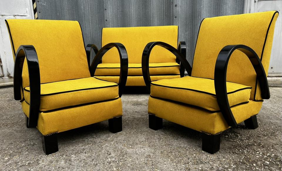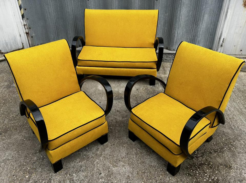 F149 - Štílová sedacia súprava v extravagantnom prevedení a farbách! Kompletne zrenovovaná, s vyzývavými tvarmi a krásnými ohýbanými podrúčkami v štýle art DECO/retro. Ihneď k odberu!!!