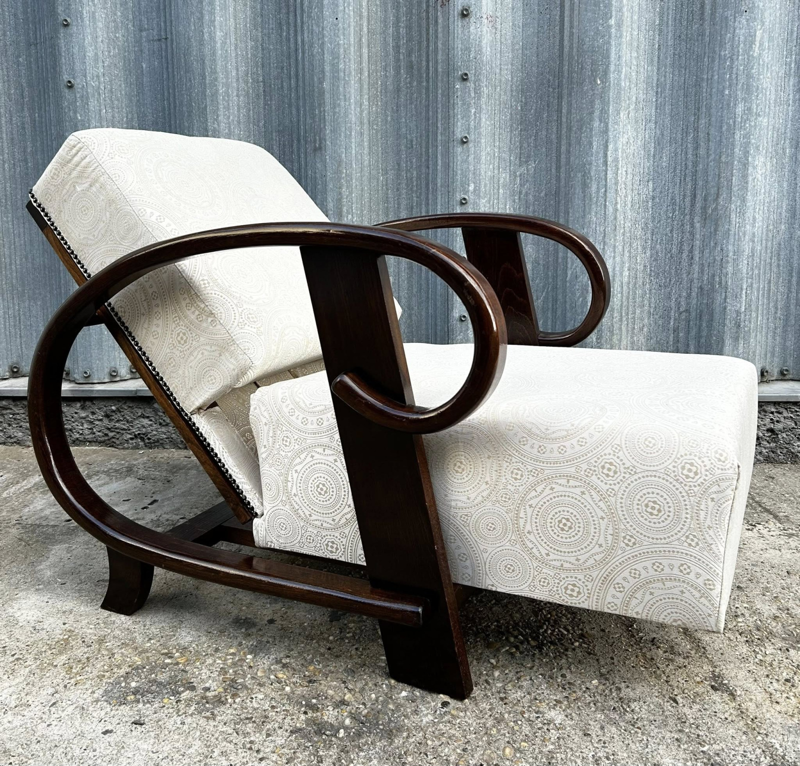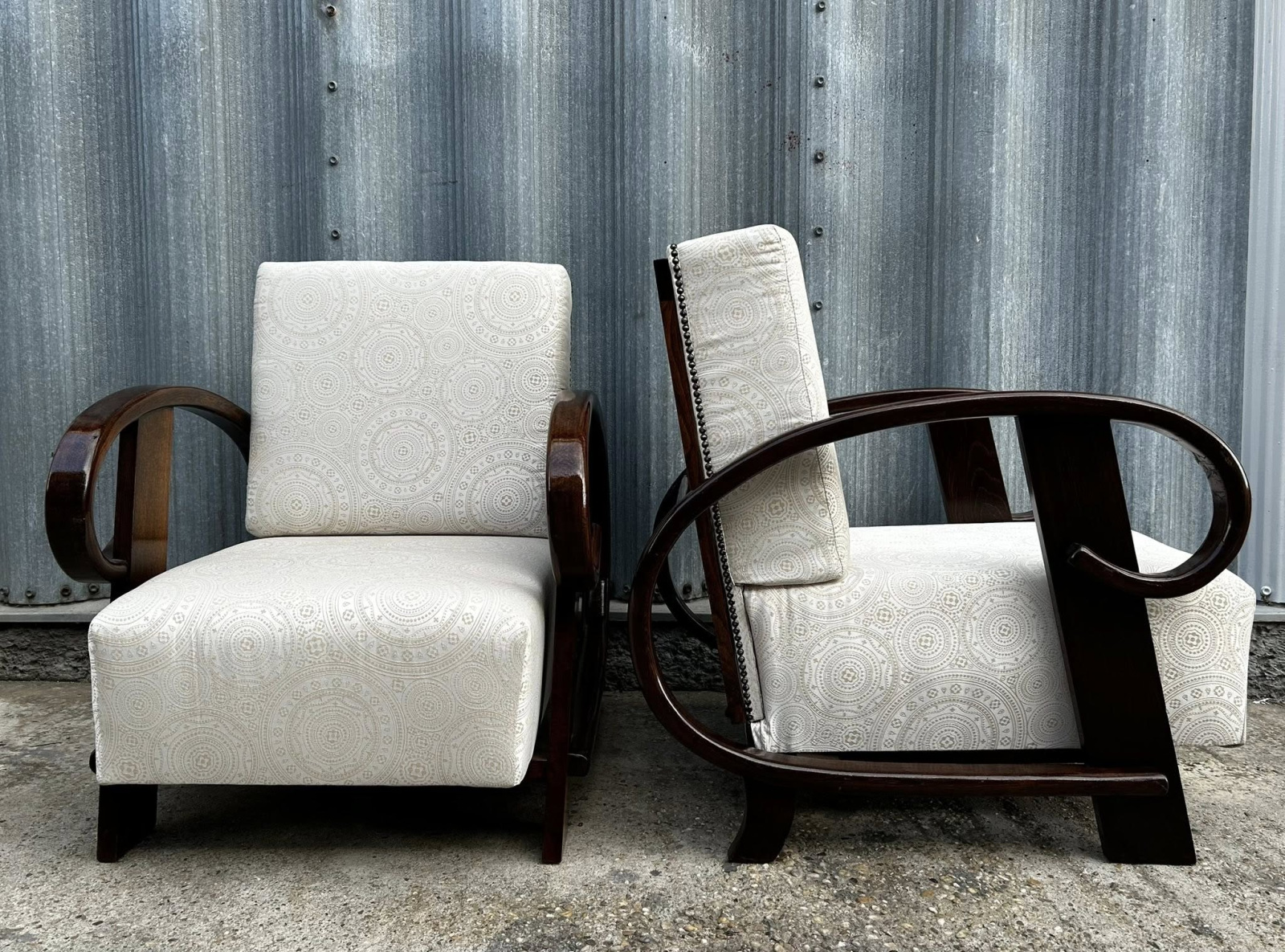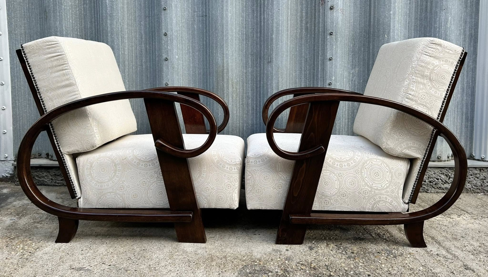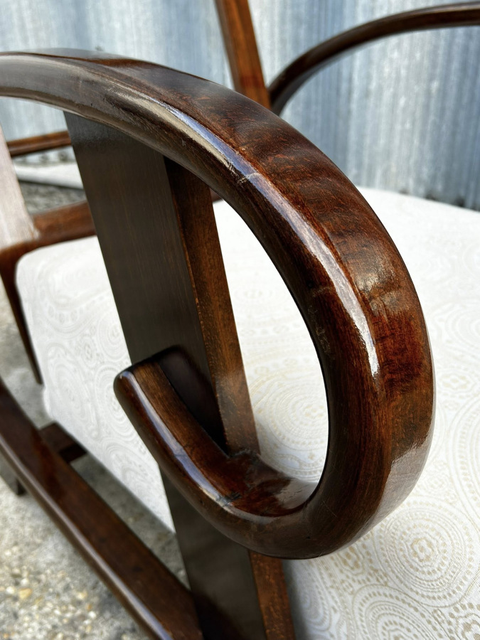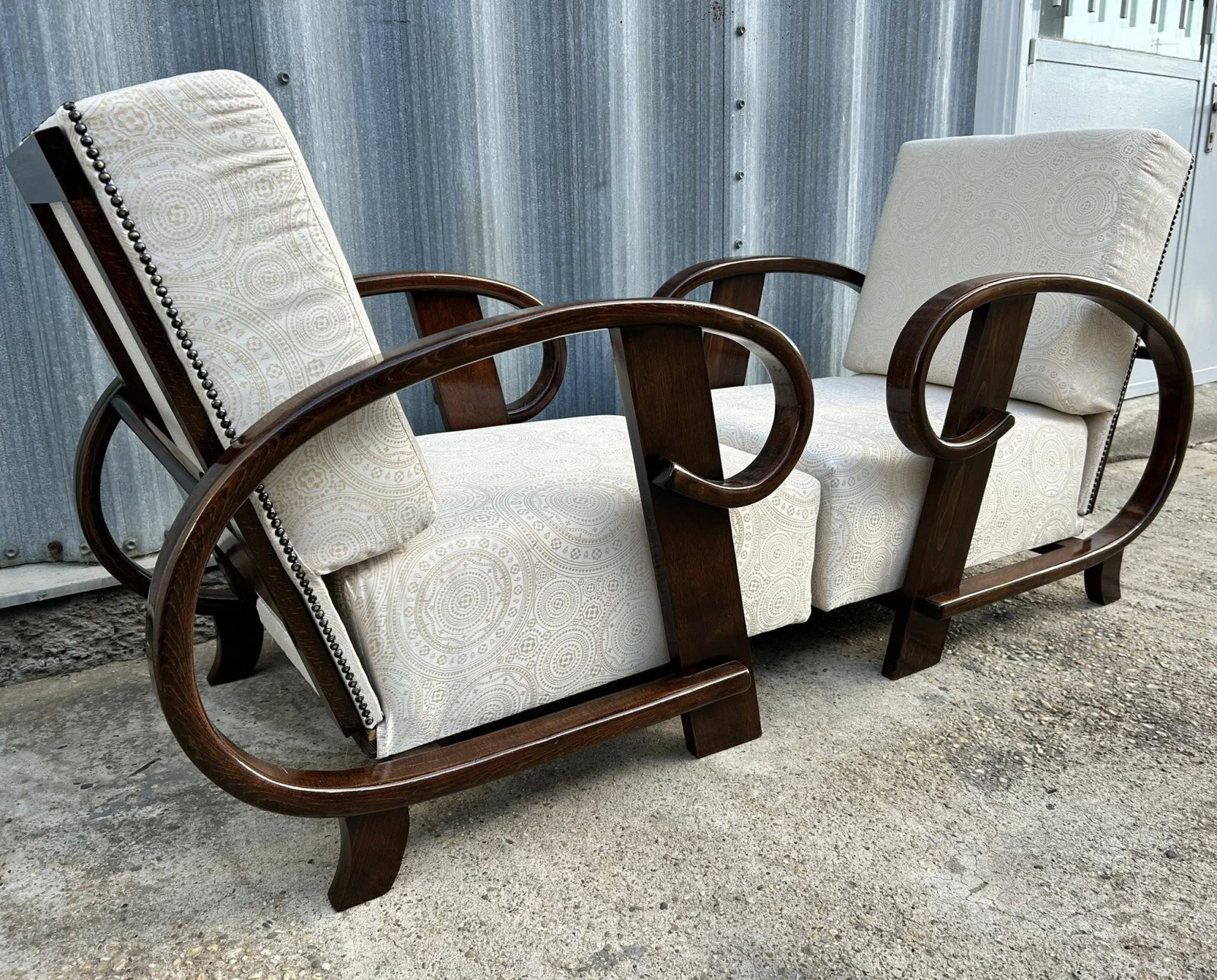 F166 - Vzácne dizajnové kreslá Vienna Pancota . (1903-1932) Vyrobené pravdepodobne v Thonet Brothers Austria. Krásne ohýbané podrúčky a celá konštrukcia vyrobená z dubového dreva. Štýlový poťah na polohovaťelných sedátkách ! Originálna poctivá politúra na dreve!!! Jednoznačne zberateľský kus nábytku!