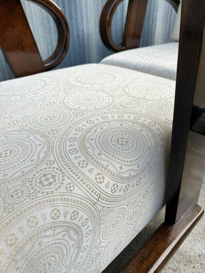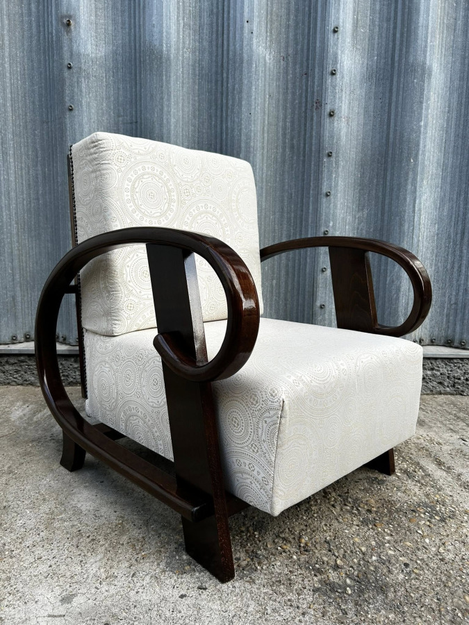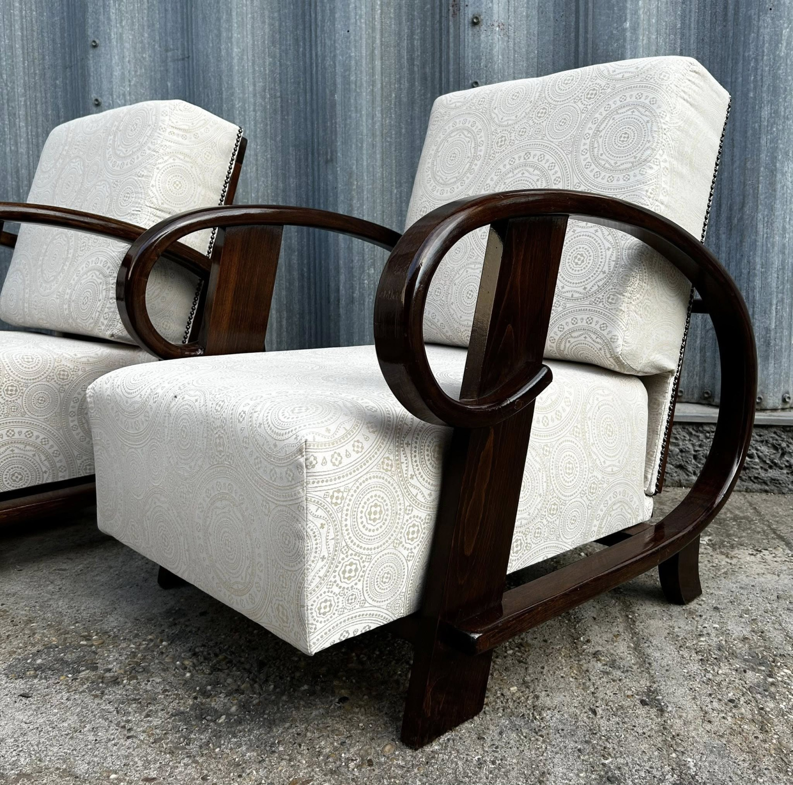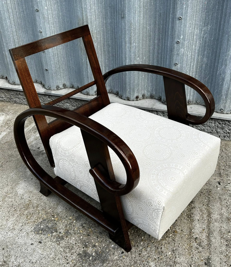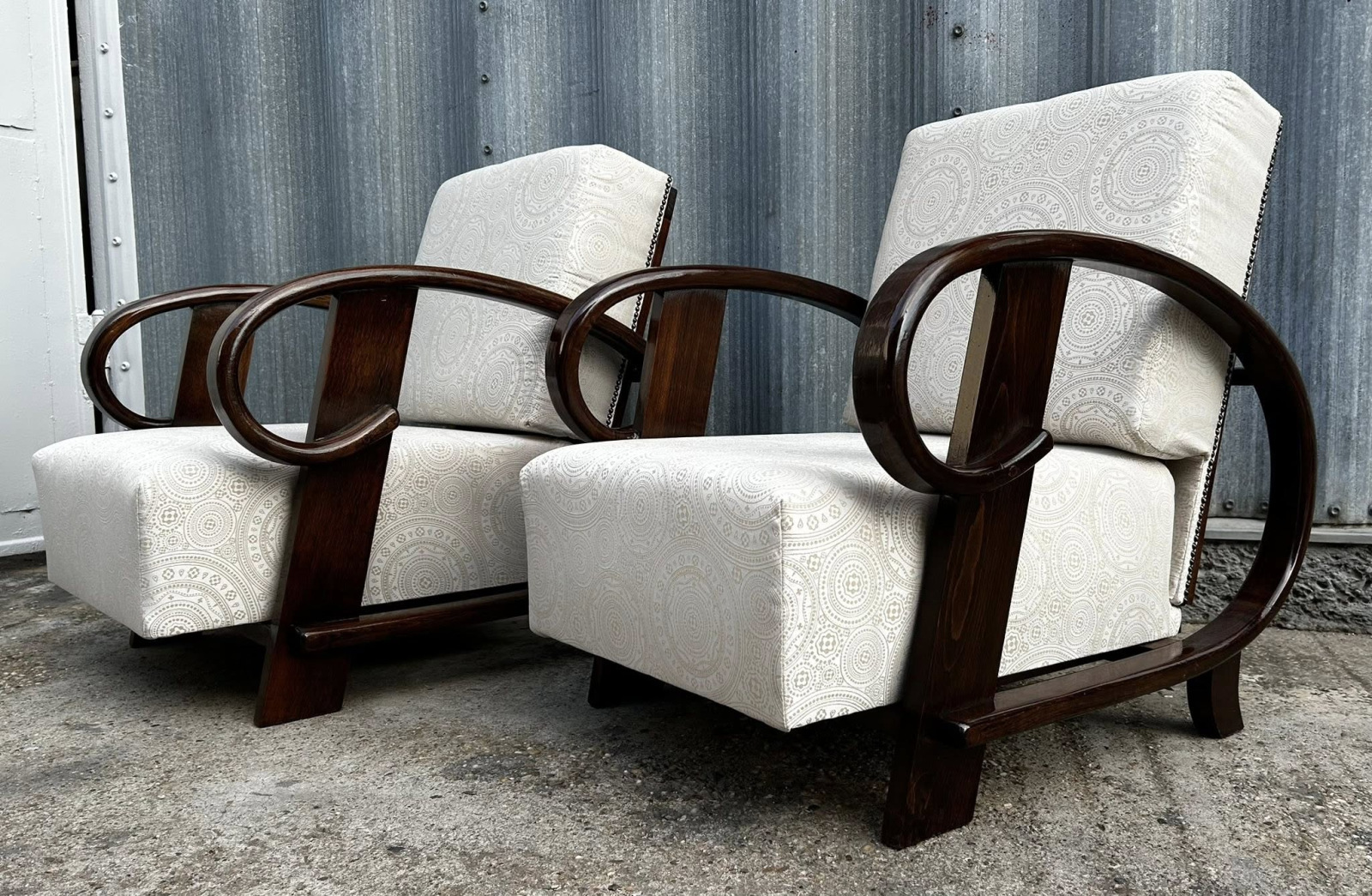 F166 - Vzácne dizajnové kreslá Vienna Pancota . (1903-1932) Vyrobené pravdepodobne v Thonet Brothers Austria. Krásne ohýbané podrúčky a celá konštrukcia vyrobená z dubového dreva. Štýlový poťah na polohovaťelných sedátkách ! Originálna poctivá politúra na dreve!!! Jednoznačne zberateľský kus nábytku!