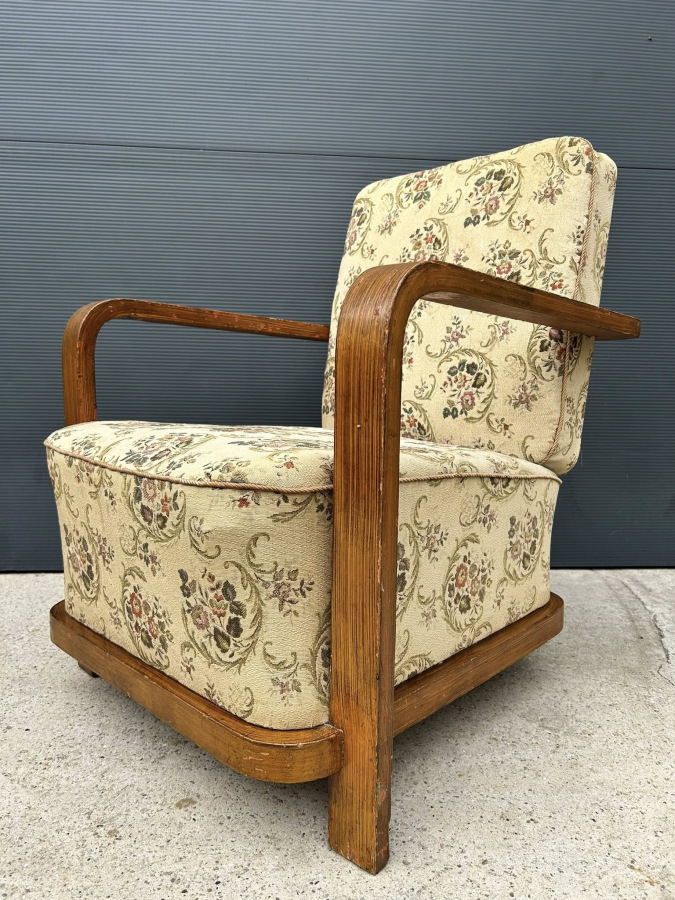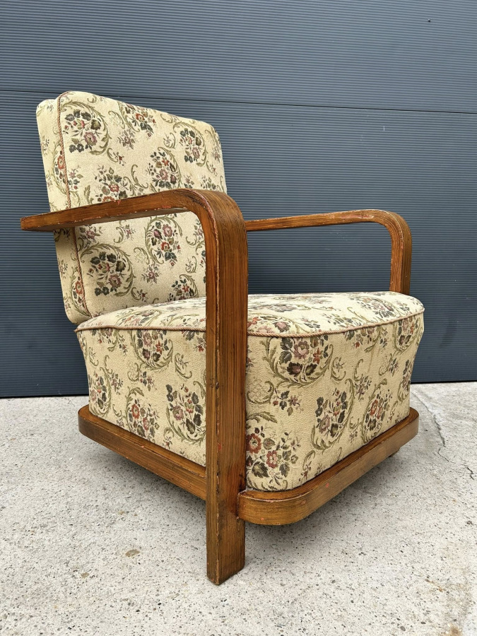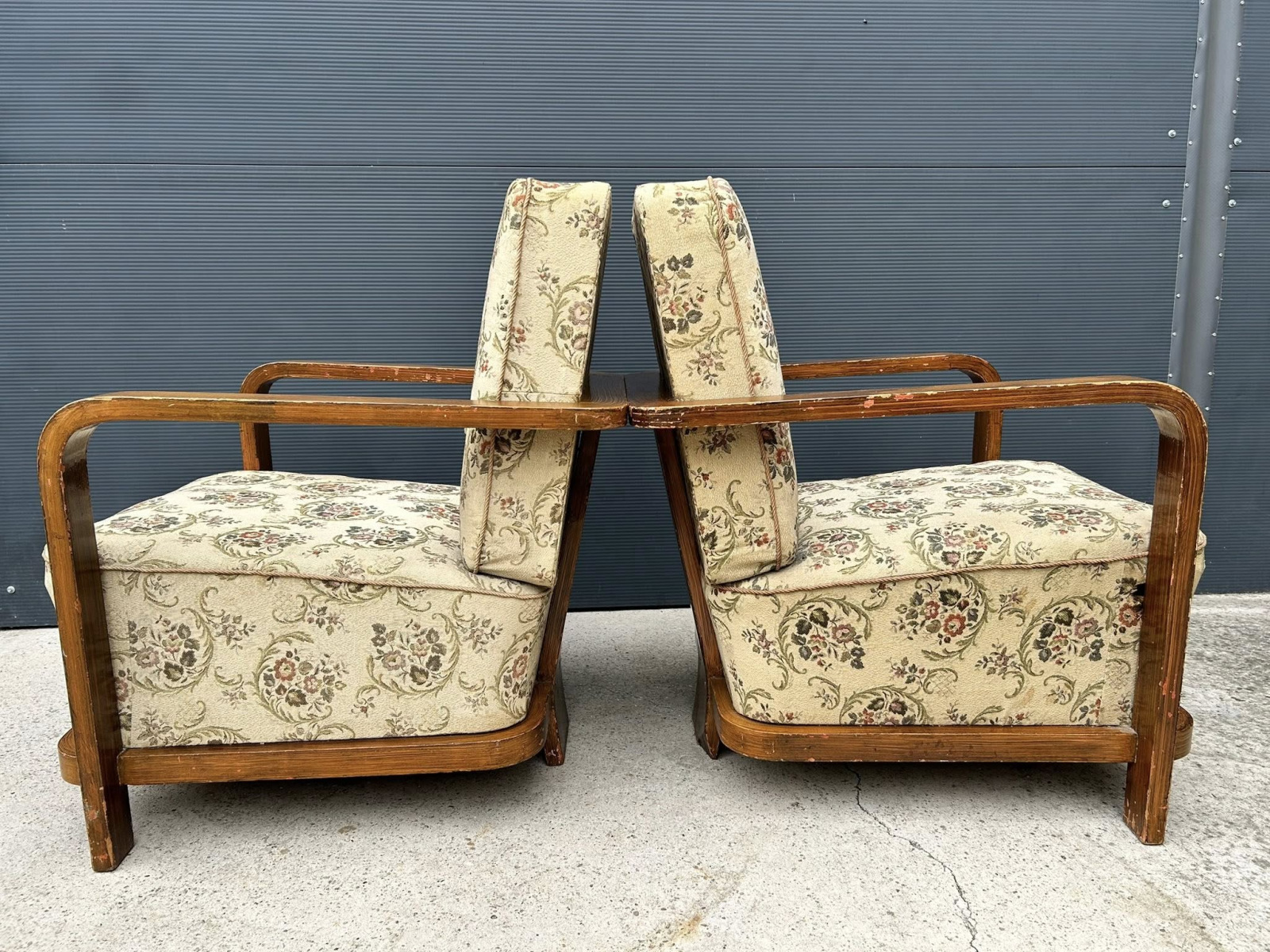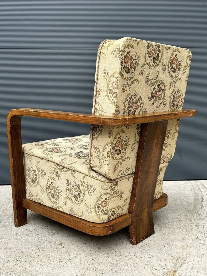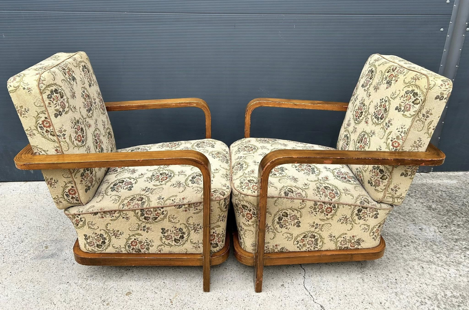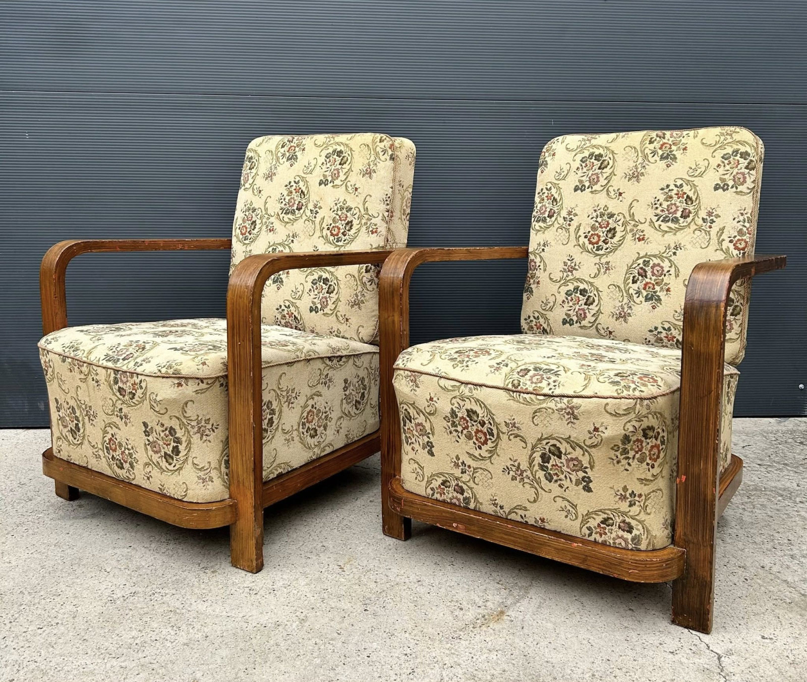 F169 - Unikátné kreslá. Kreslá na troch nohách v peknom bytovom stave s pôvodnou dobovou látkou a krásnymi ladnými tvarmi.