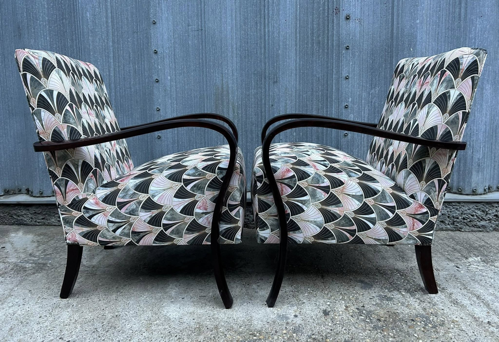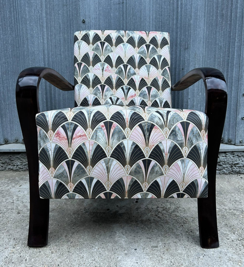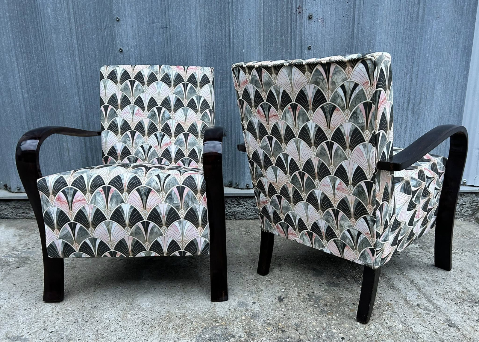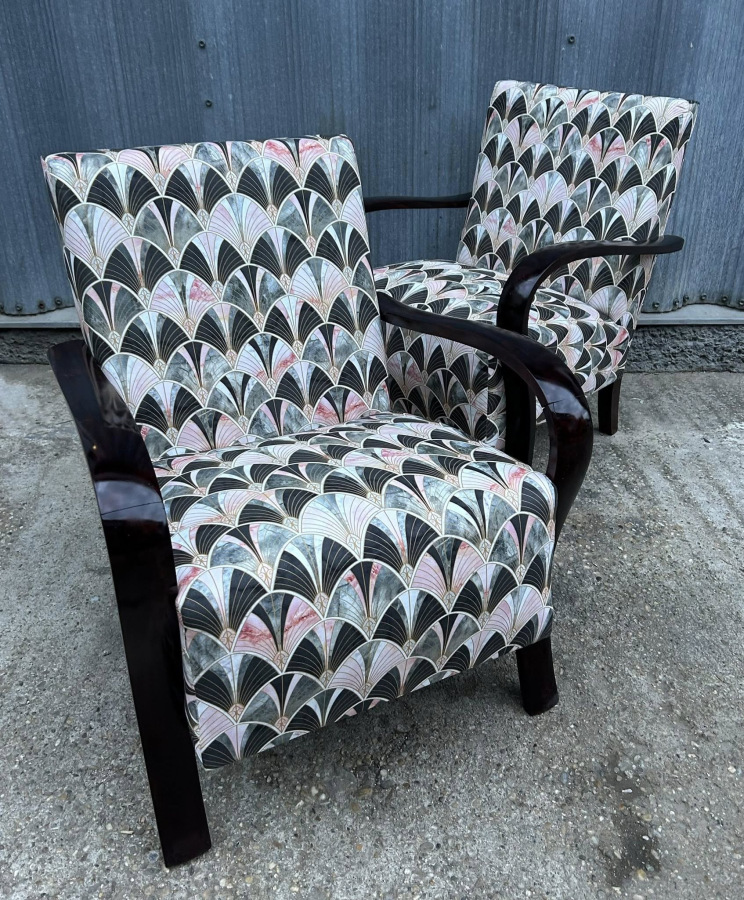 F174 - Art DECO kreslá s krásnou tematickou poťahovou látkou (pávie pero) Kompletne zrenovované, ihneď k odberu!!!