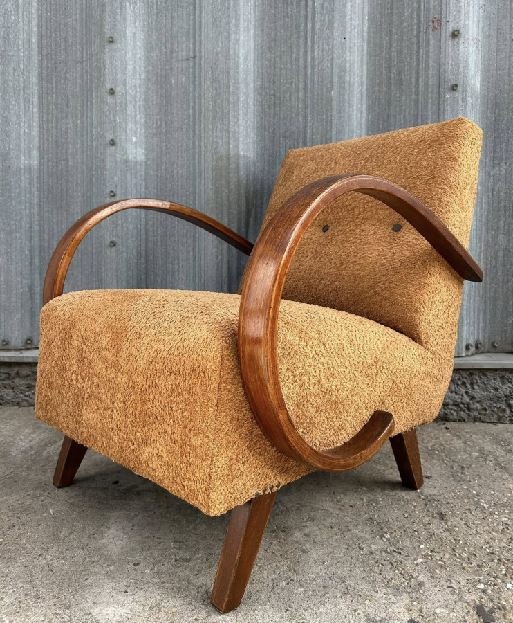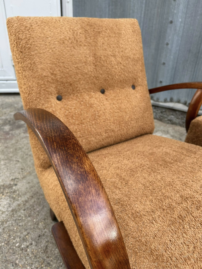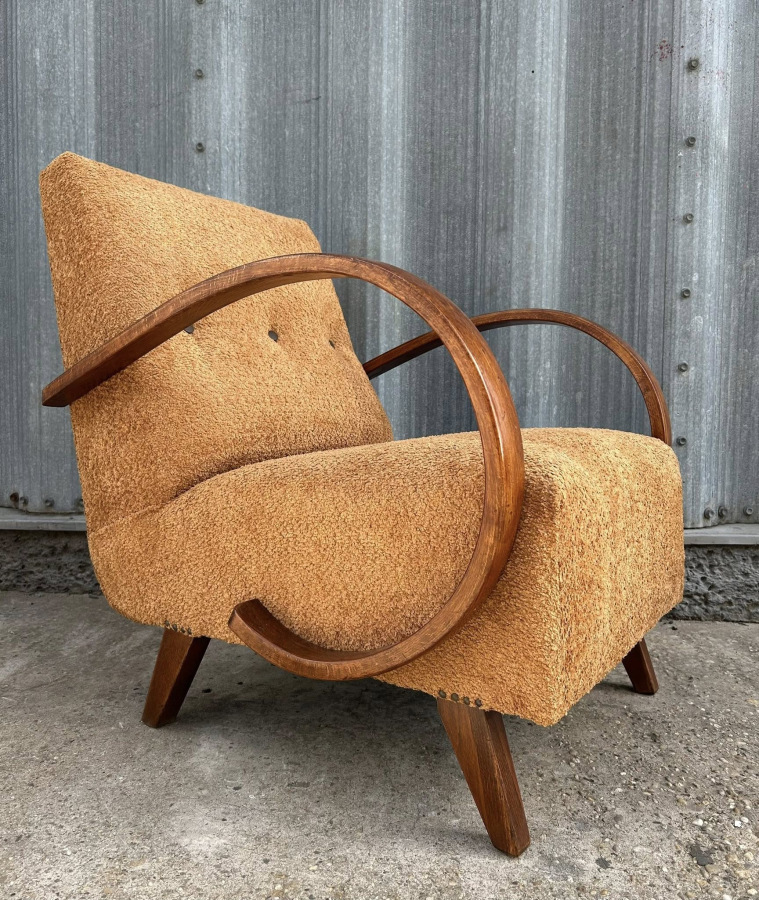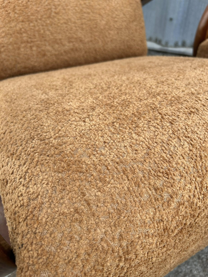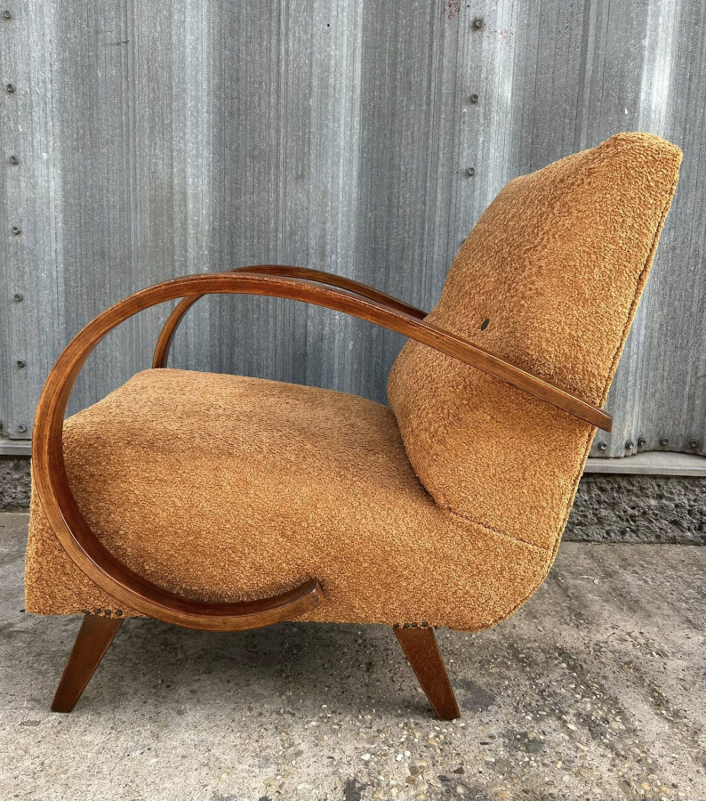 F176- Kreslo HALABALA, kompletne zrenovovamé, aj drevo aj poťah!!! V krásnej “BUKLÉ” látke. Ikonické kresla “C” profil.