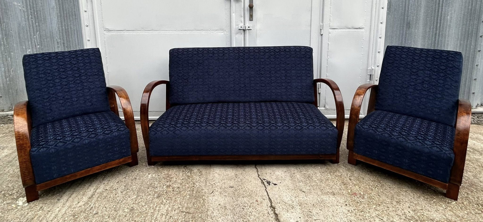 F195 - Sedacia súprava v čistom štýle “Art DECO” s ohýbanými podrúčkami. Kompletne zrenovované s jemnou “GEO” látkou!