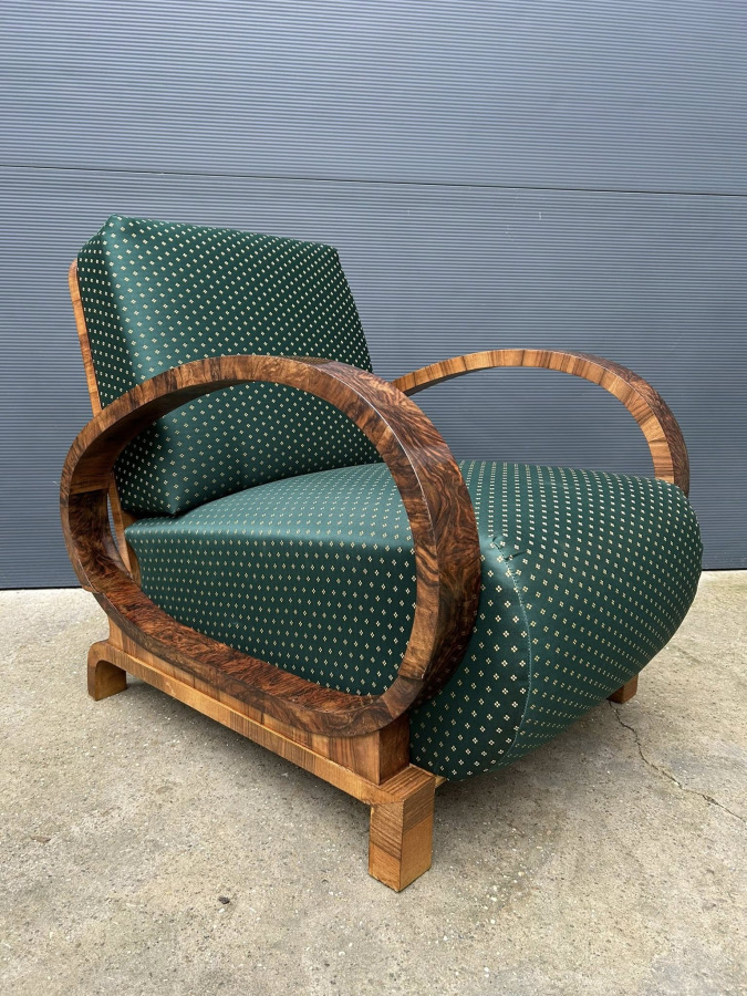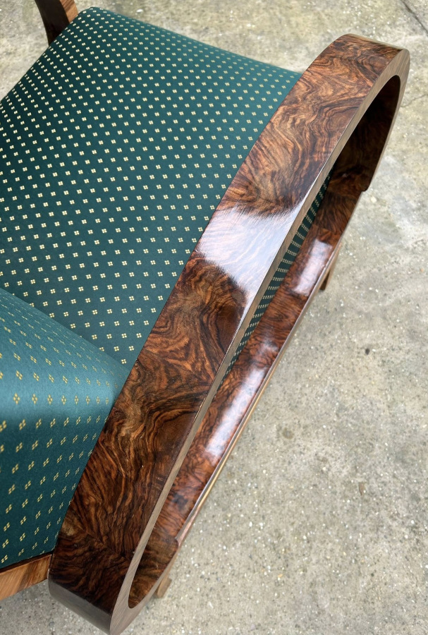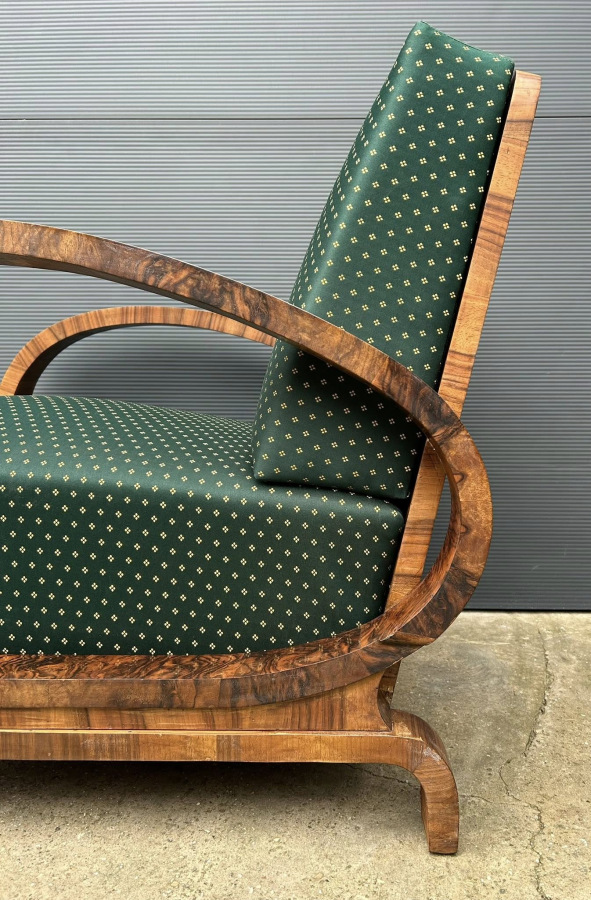 F199 - Famózne Art DECO kreslá po kompletnej renovácii, s tradičnou politúrou a tematickou poťahovou látkou s efektom (chameleón) !!! Zriedkavé kreslá s ohýbanými podrúčkami potiahnuté dyhou z amerického orecha, ktorú zvýrazňuje šelaková politúra. Zberateľský kus.