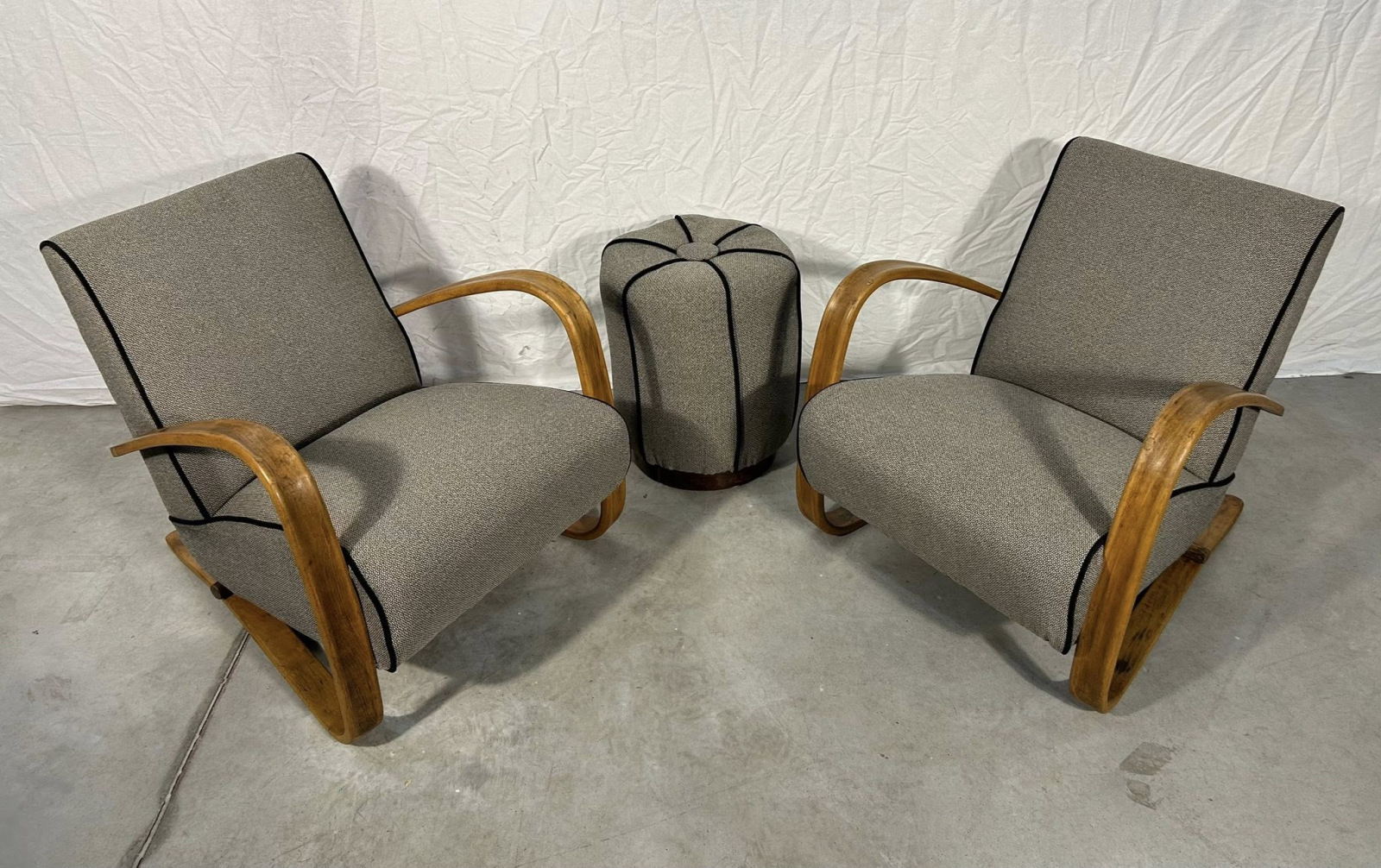 F201 - Kreslá J. HALABALA H-269 po kompletnej renovácii látka + drevo (drevo v polo-matnom, svetlom prevedení) s taburetkou. Povrchová úprava politúra!
