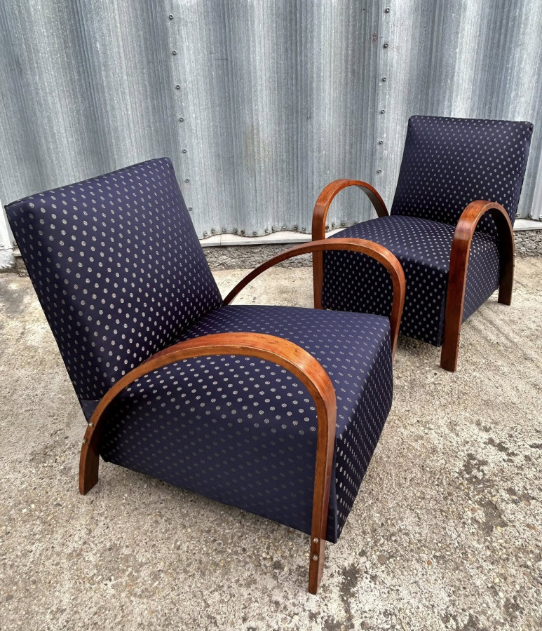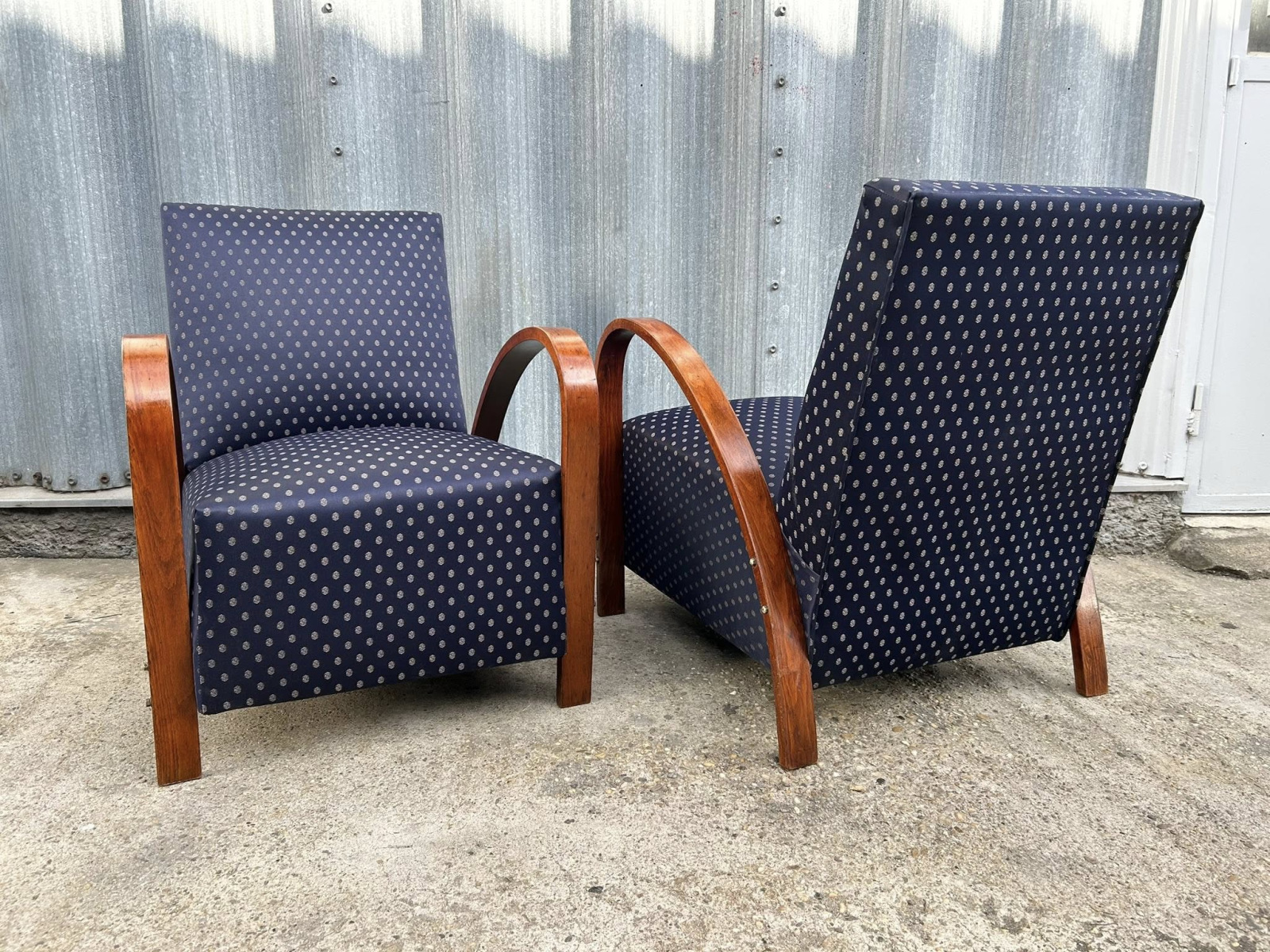 F209 - Ikonické Art DECO kreslá po renovácii. Kvalitná tematická poťahová látka modrej farby len potvrdzuje luxusné vyhotovenie týchto kresiel s ohýbanými podrúčkami z dubového dreva! Zberatelský kus!!