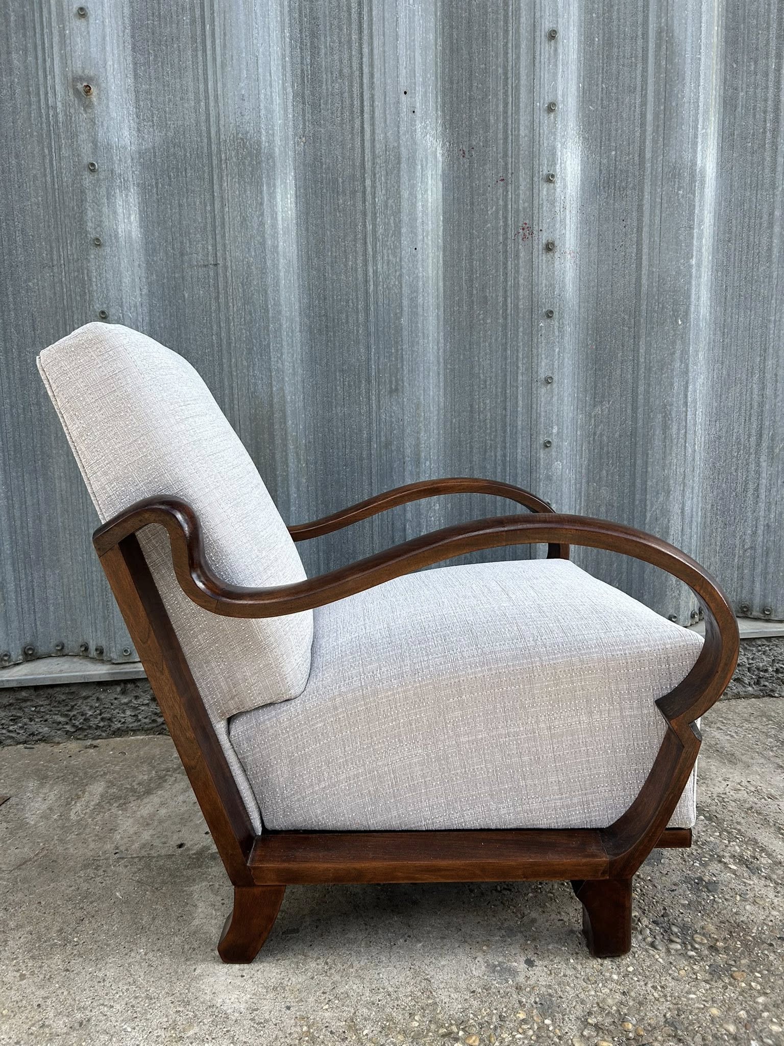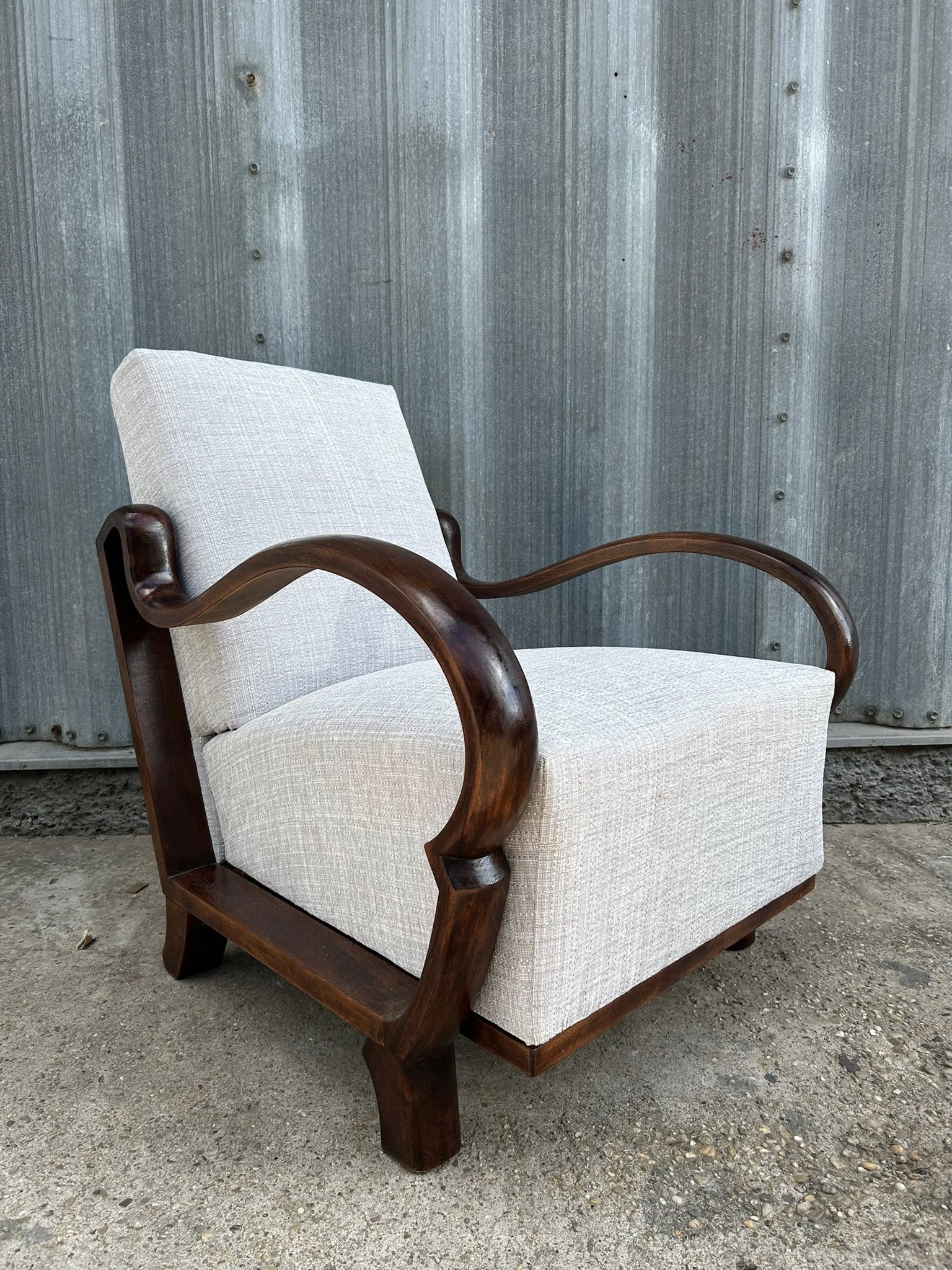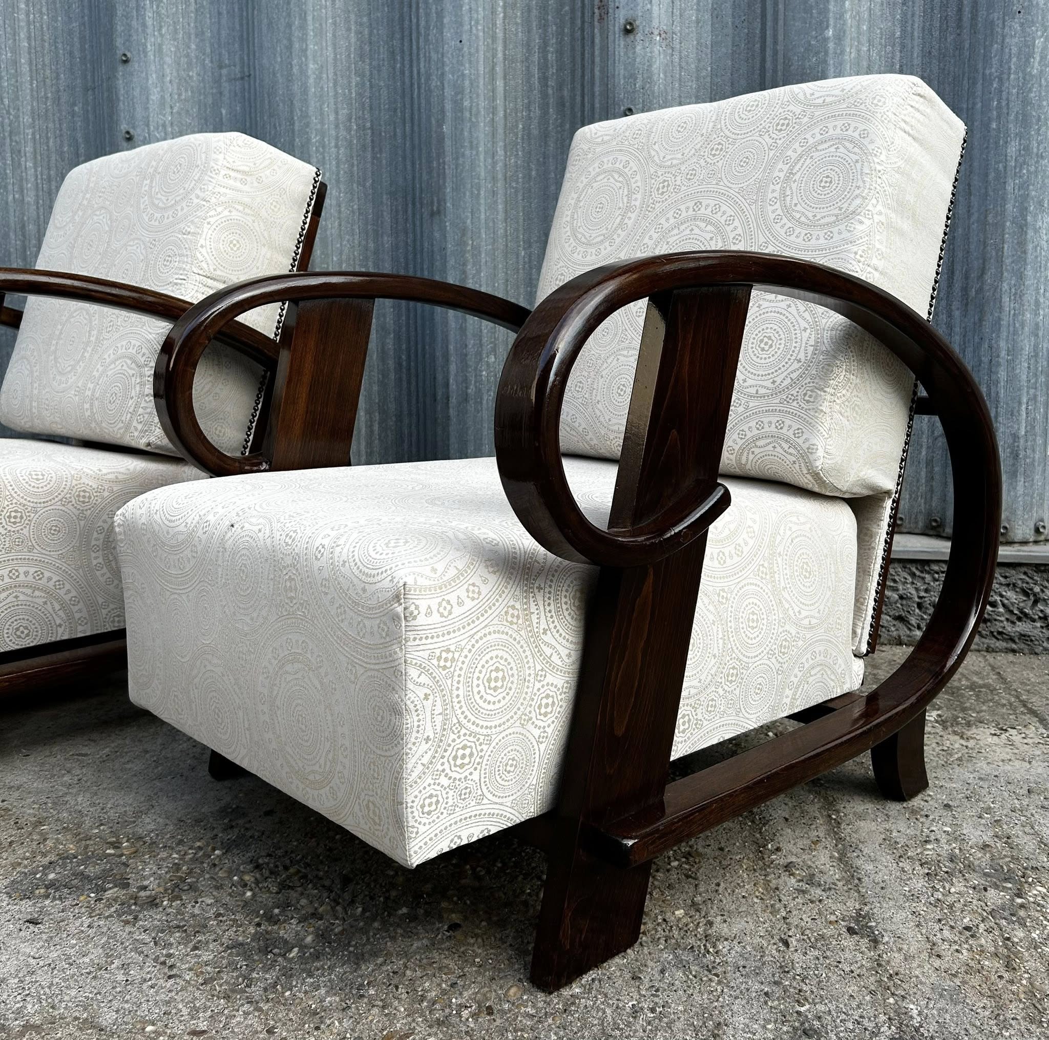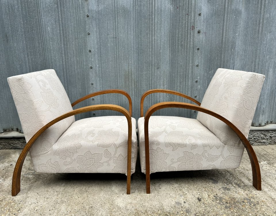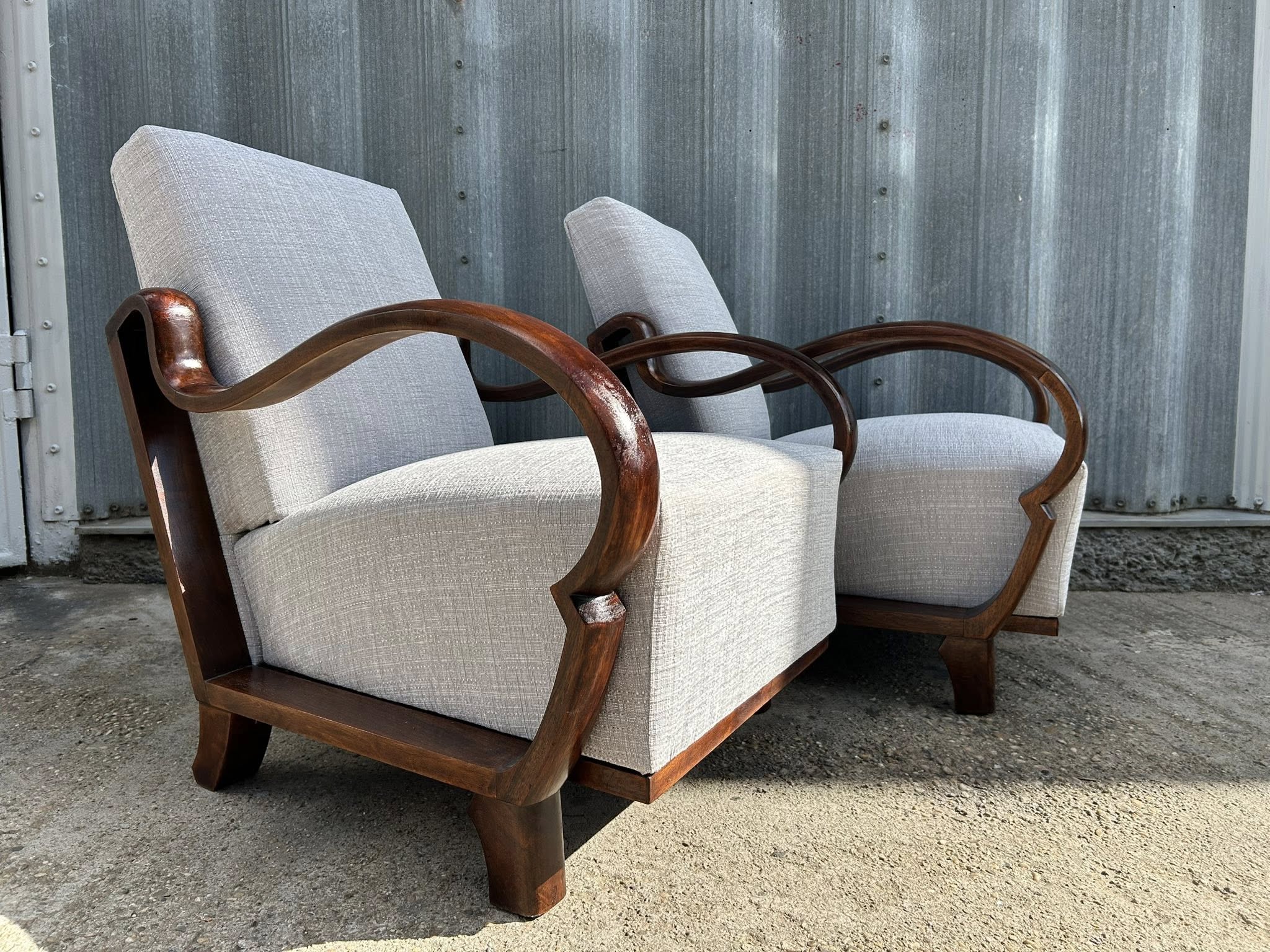 F140 - Ikonické Art DECO kreslá, dizajnový prvok, s krásnymi ohýbanými podrúčkami. Po renovácii dreva!!! Kreslá vieme dať prečaluniť podľa vaších predstáv, do Vami dodanej poťahovej látky. Cena pred čalúnením 400€/ks