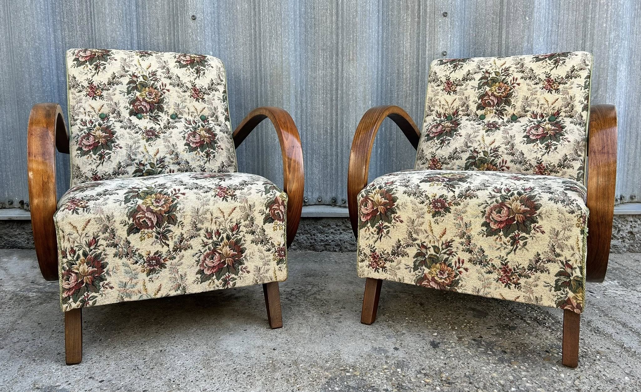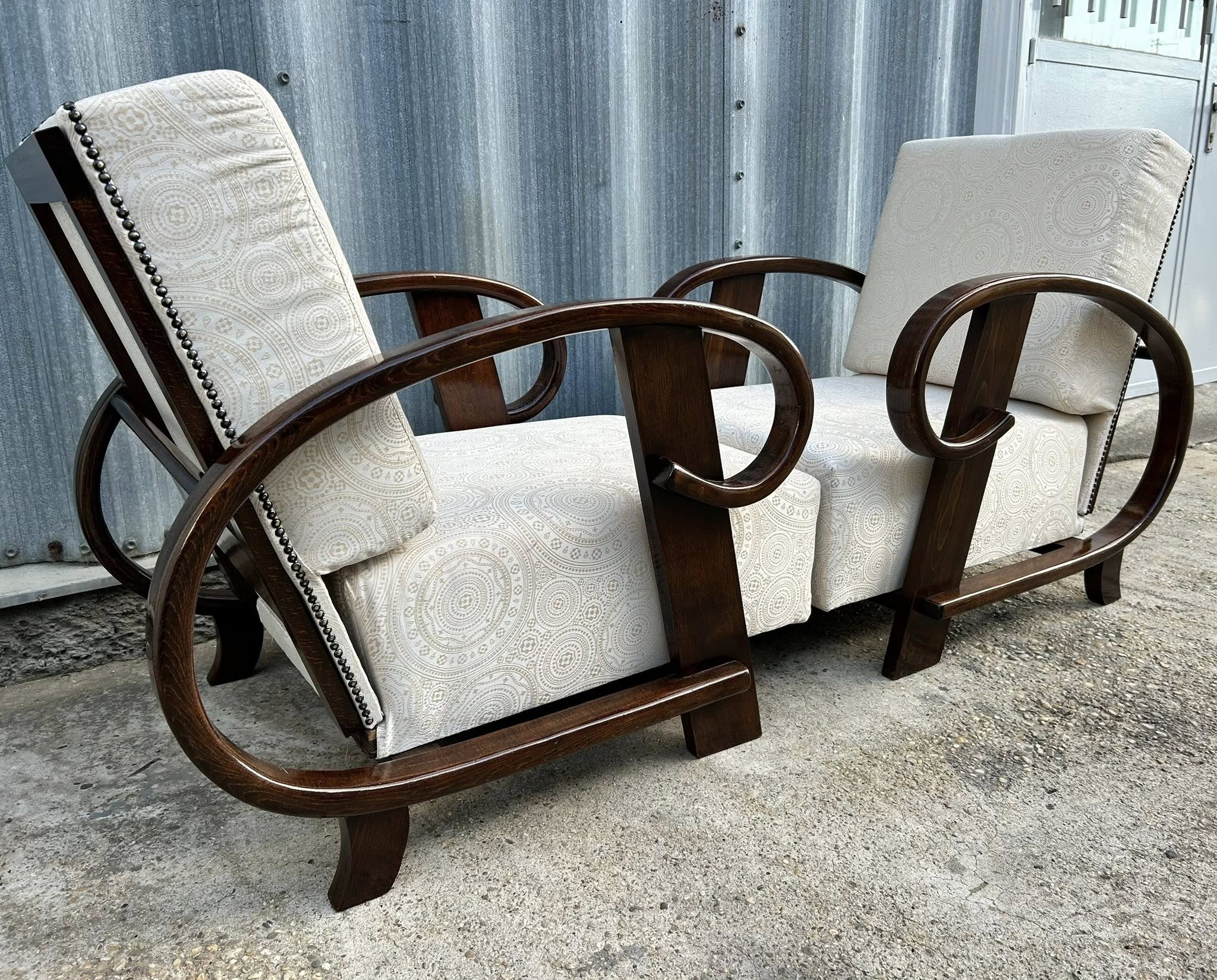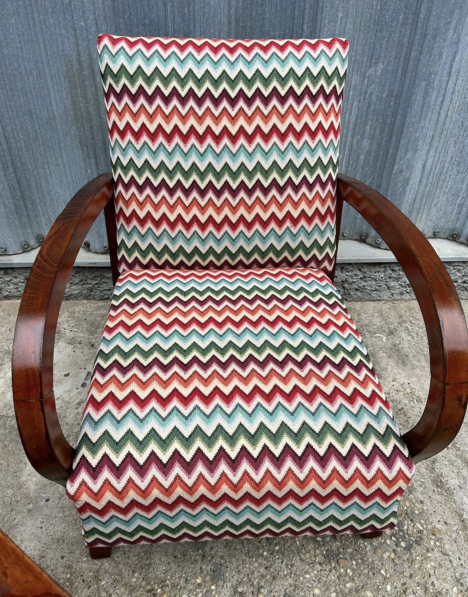 Art DECO kreslá s ohýbanými podrúčkami a poťahom typickým pre kreslá s obdobia Art DECO.