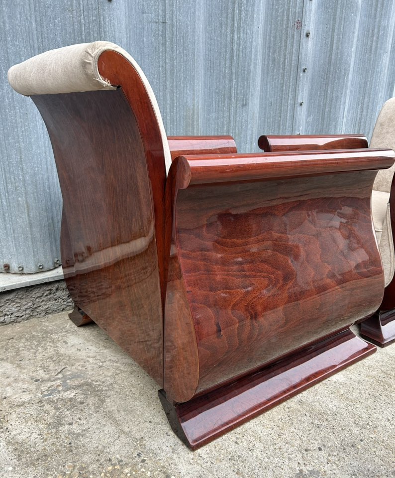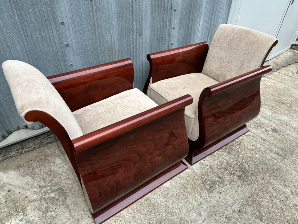 F197 - Art DECO kreslá zrenovované s tradičnou politúrou s dyhovanými podrúčkami, a vyberacími vložkami s jemným poťahom v staroružovej farbe. Kreslá sú v jedinečnom stave, viď foto! Zberateľský kus nábytku!!! Cena 1600€/pár. (Predávajú sa len spolu)