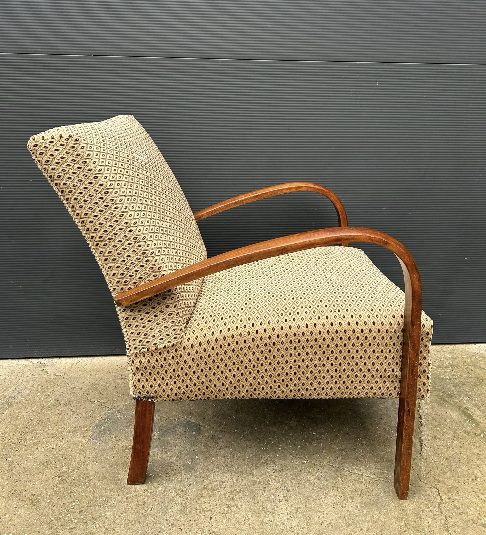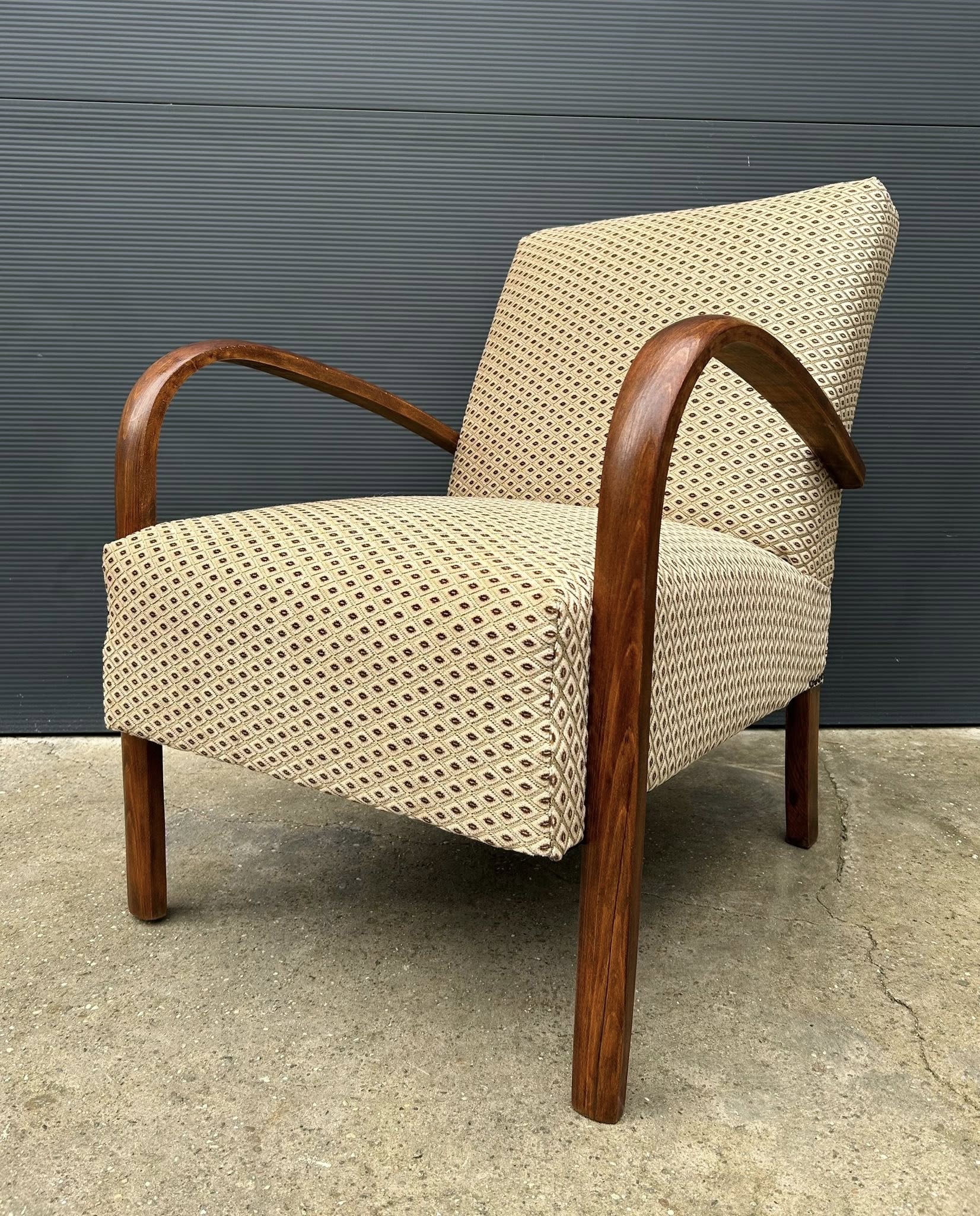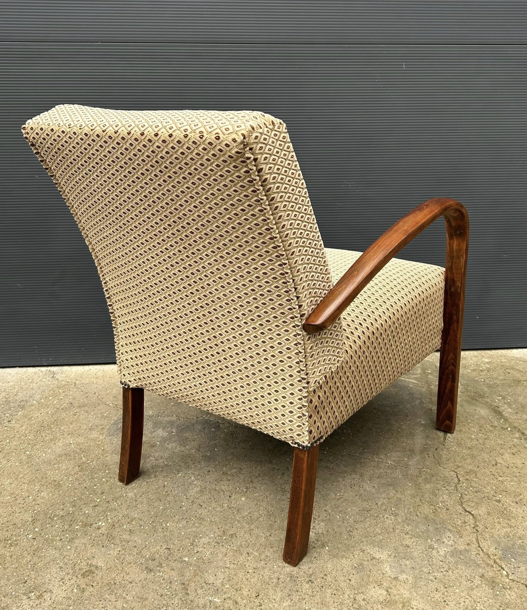 F179 - Kreslo J. Halabala H-213 (1 kus). Zrenovované, decentné kreslo J. Halabalu, so štýlovou poťahovou GEO látkou, podrúčky s ohýbaného dubového dreva. Cena 380€ 🌺🌸☀️