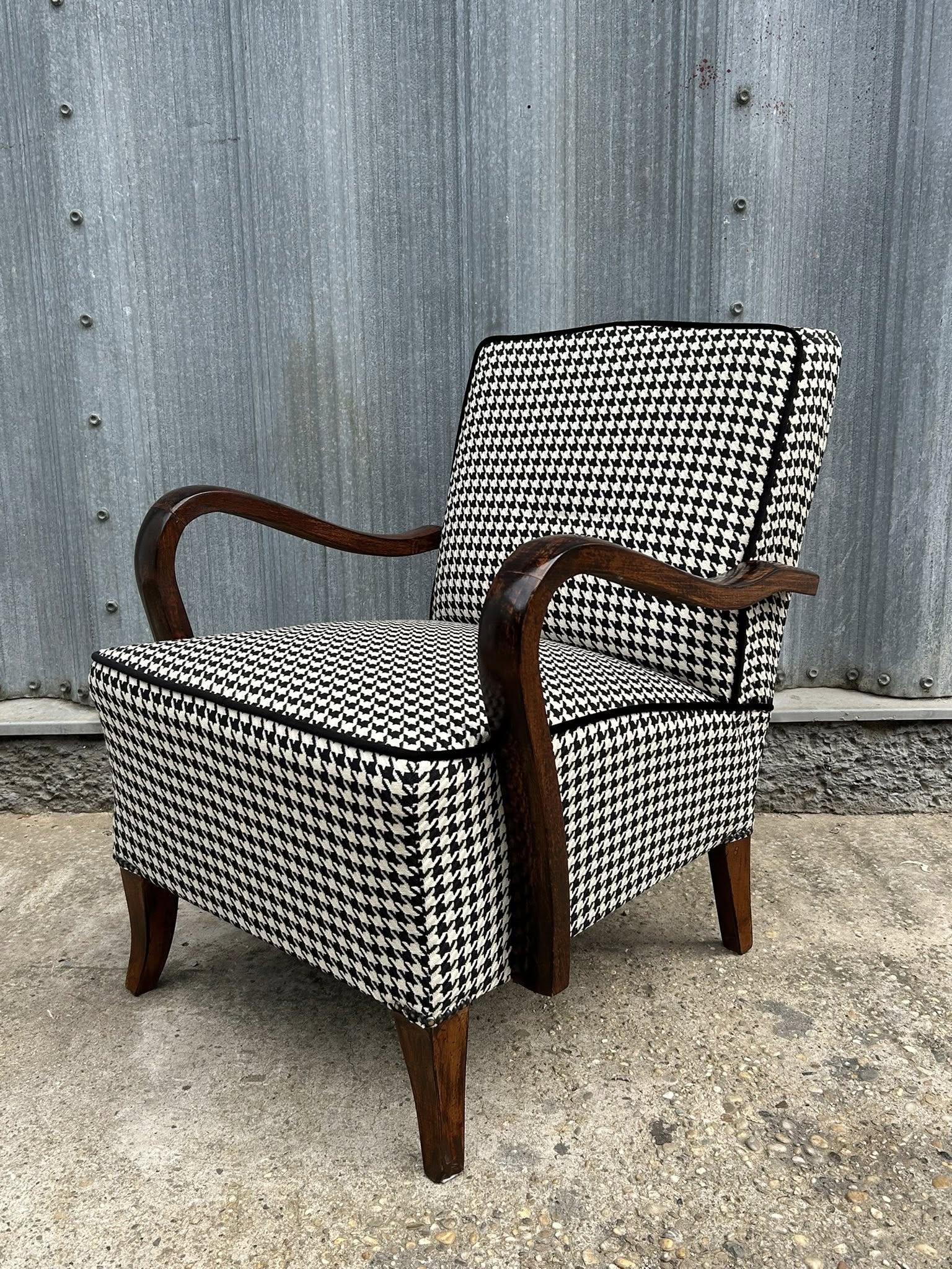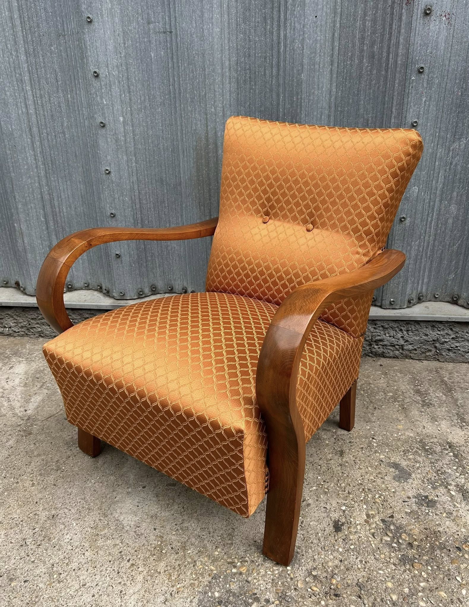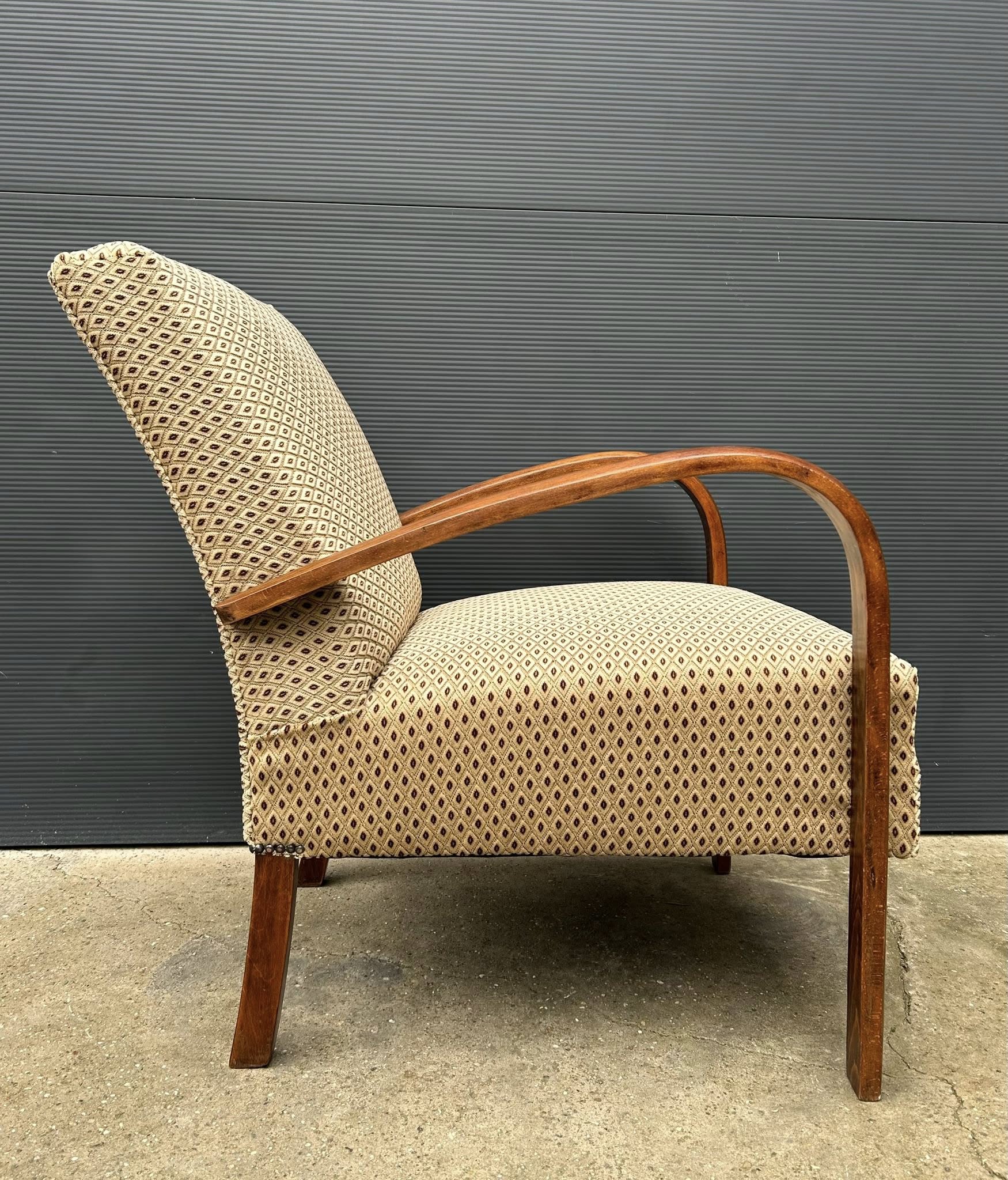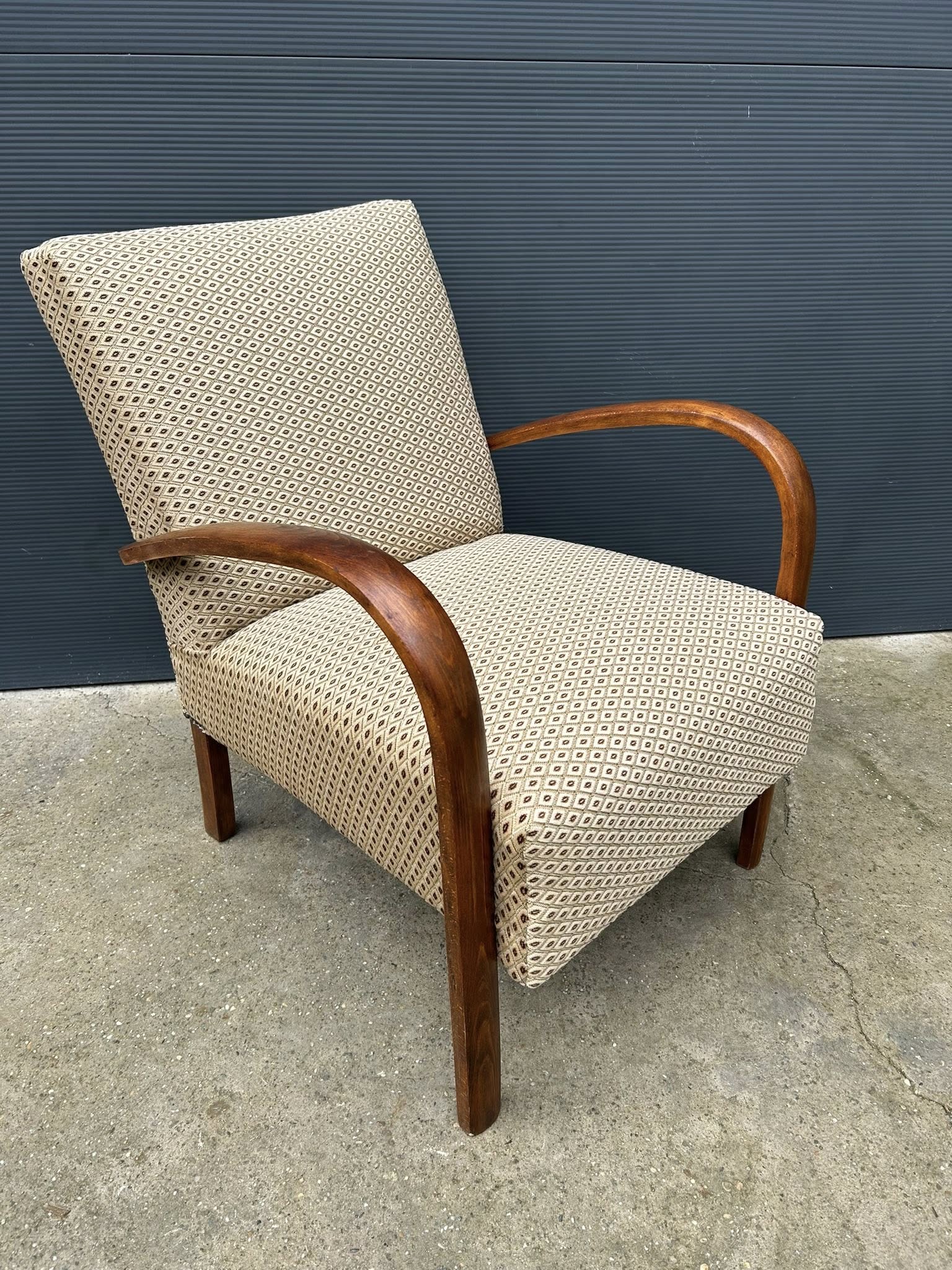 F179 - Kreslo J. Halabala H-213 (1 kus). Zrenovované, decentné kreslo J. Halabalu, so štýlovou poťahovou GEO látkou, podrúčky s ohýbaného dubového dreva. Cena 380€ 🌺🌸☀️