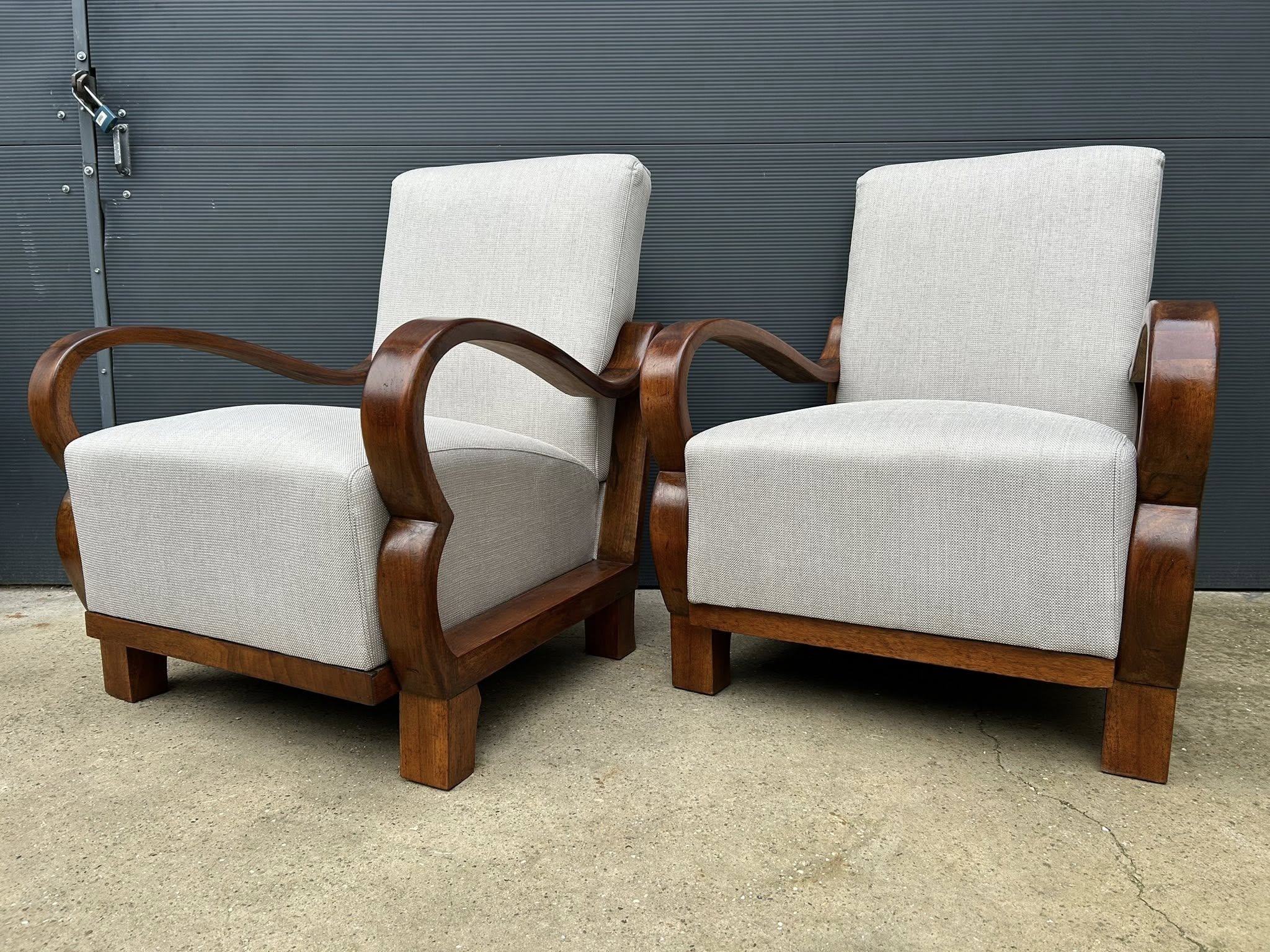 F194 - Art DECO kreslá zrenovované, s decentnou poťahovou látkou a zriedkavo ohýbanými a tvarovanými podrúčkami z orechového masívu, čo je úpná rarita!!! Krásna kresba orechového dreva na podrúčkach dokonale ladí s jemným a zdržanlivým poťahom!!! Ihneď k odberu!! Cena: 980€ za pár ☑️