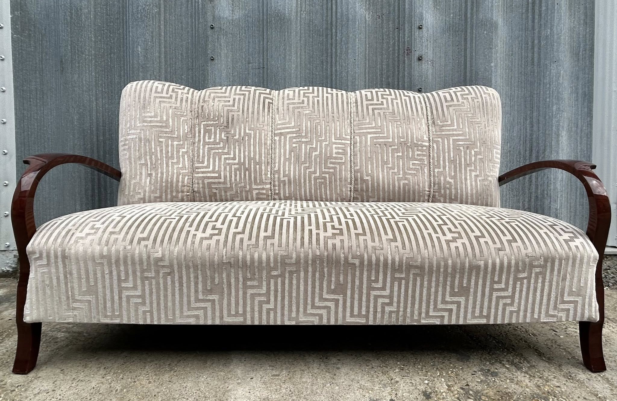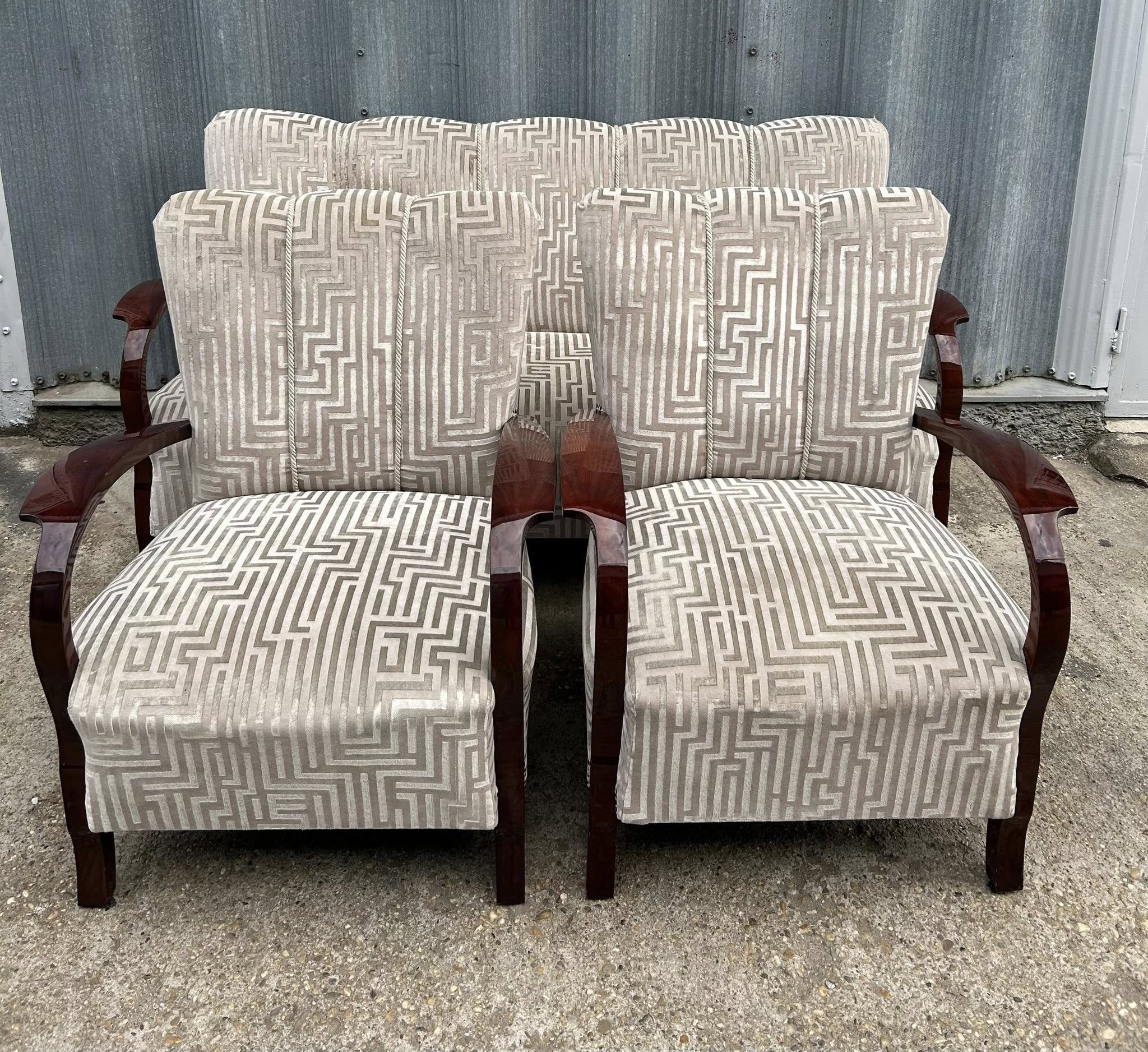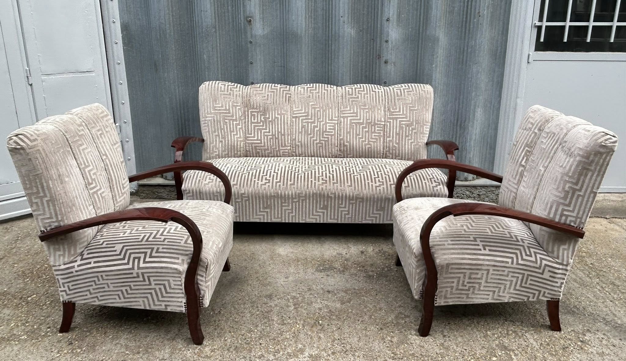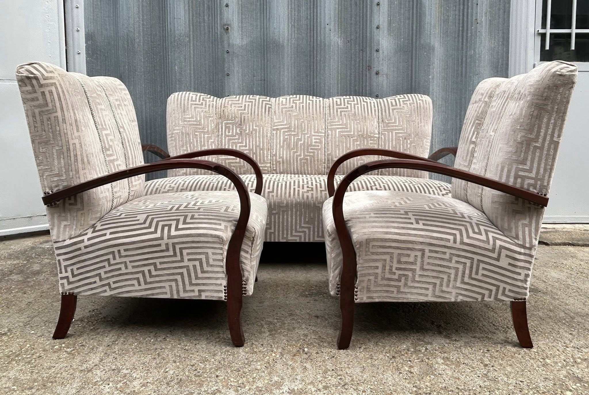 F195 - Sedacia súprava v čistom štýle “Art DECO” s ohýbanými podrúčkami. Kompletne zrenovované s jemnou “GEO” látkou!