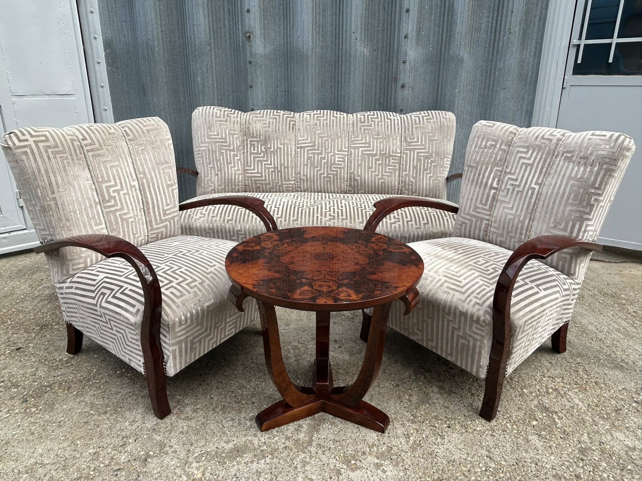 F163 - Sedacia súprava z obdobia Art DECO! V peknom bytovom stave, prečalunené cca pred 3 rokmi, pekná tematická poťahová látka! Ihneď k odberu. Garnitúra, ale hlavne kresielká boli vyrobené na námet kresiel od J. Halabalu H-237