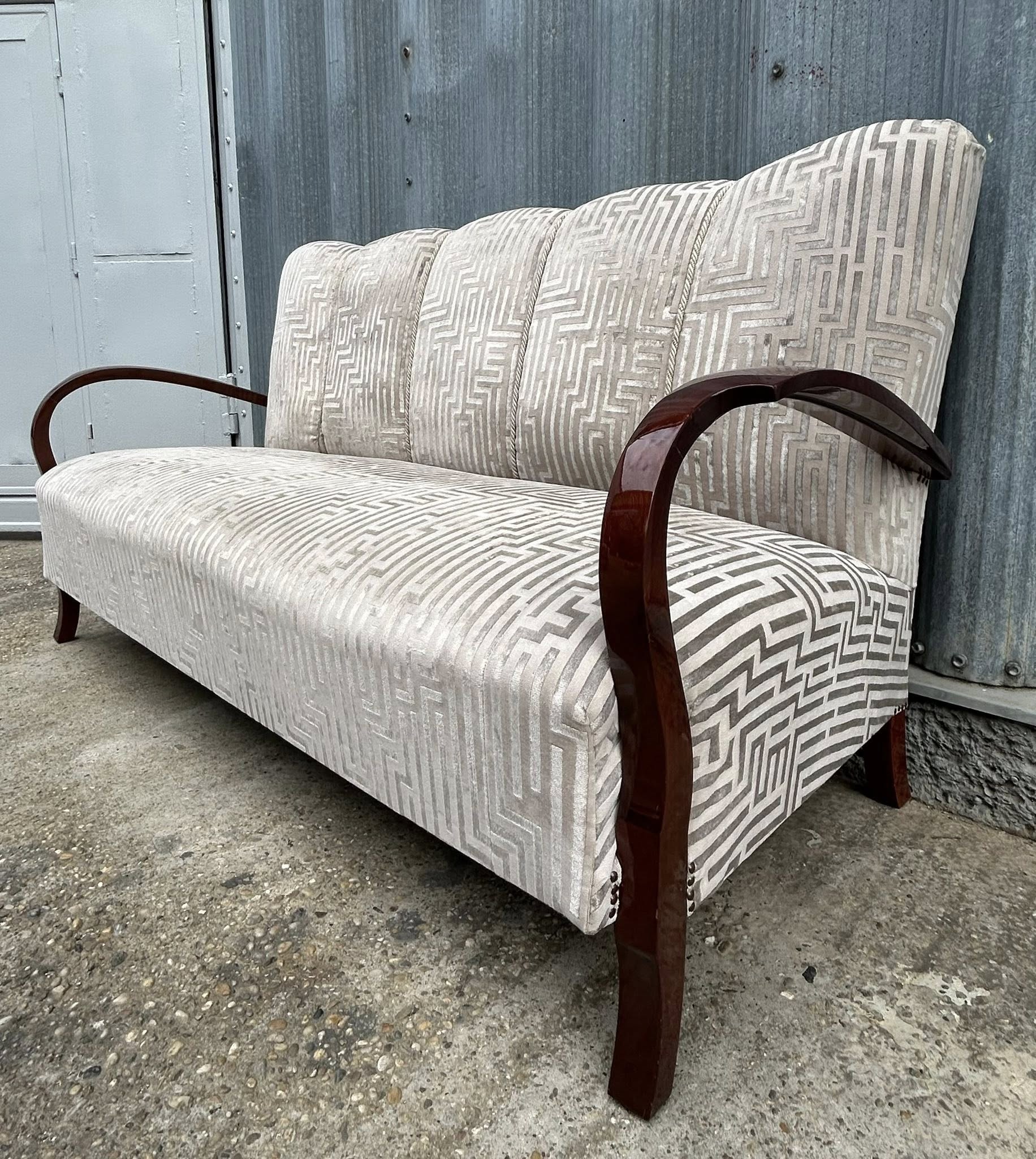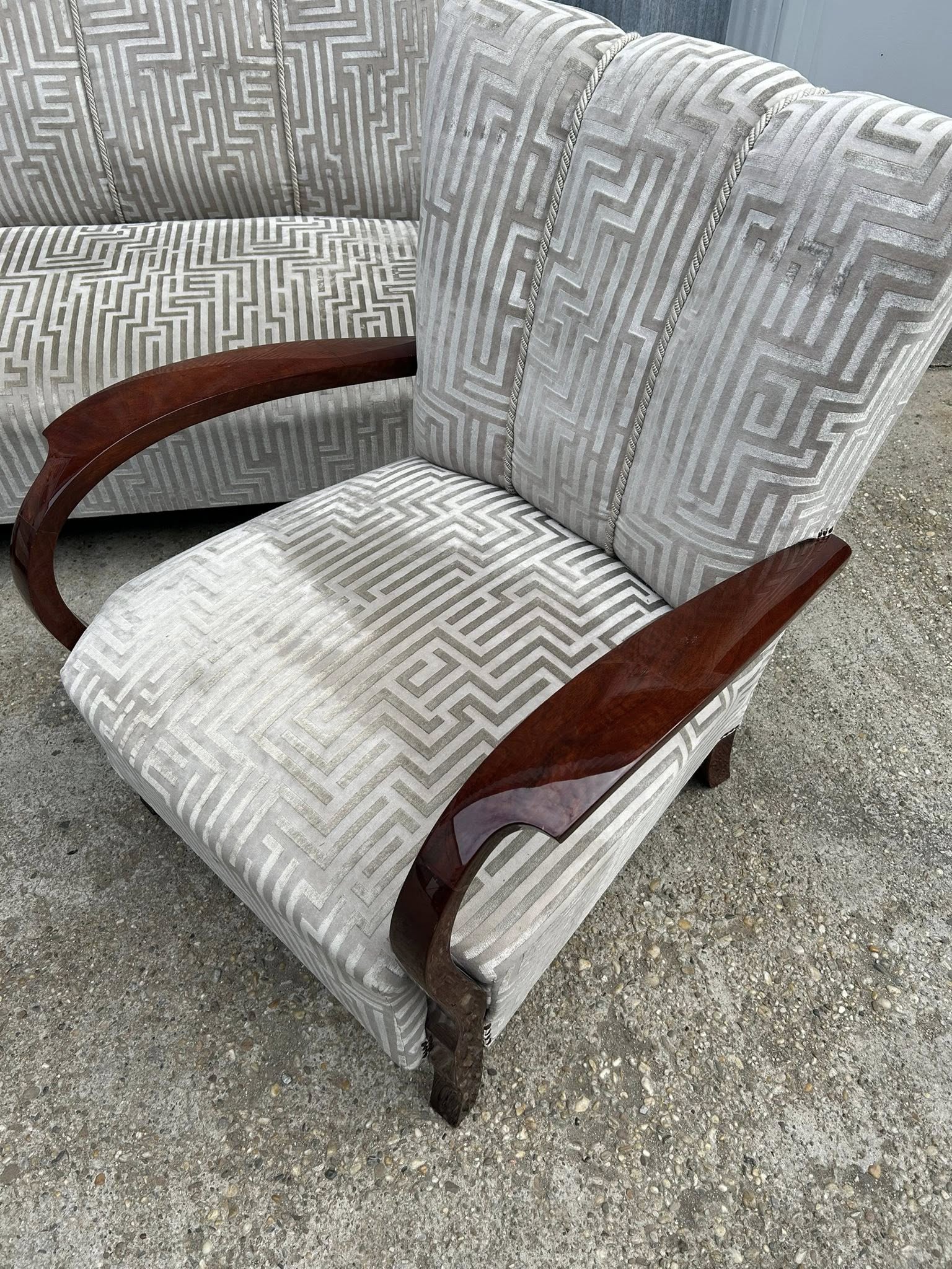 Dobová Art DECO Sedacia súprava po kompletnej renovácii, so štýlovým “GEO” poťahom, ! Všetko profesionálne zrenovované. Krásné a ladné tvary očisteného umeleckého slohu Art DECO , kopírujúce okrasné nity a tematickú poťahovú látku!