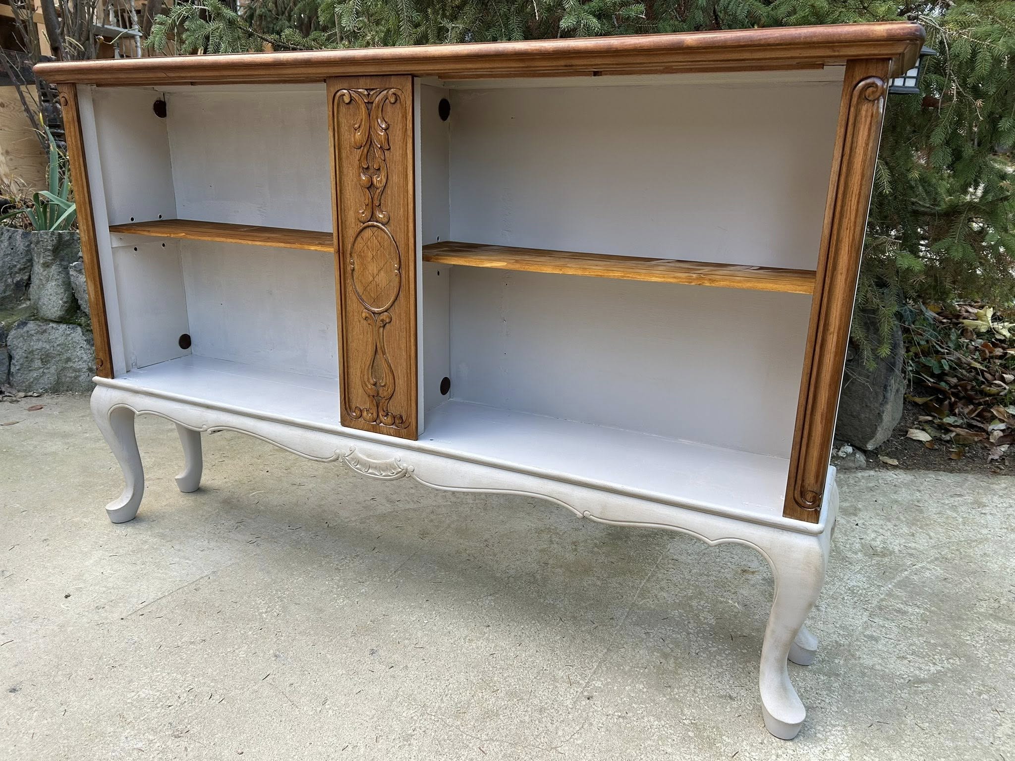 Knižnica/polica/etažér v provence farbách s jemnou patinou v kombinácii s prírodnou farbou v neobarokovom štýle. Velmi plytká, len 26 cm