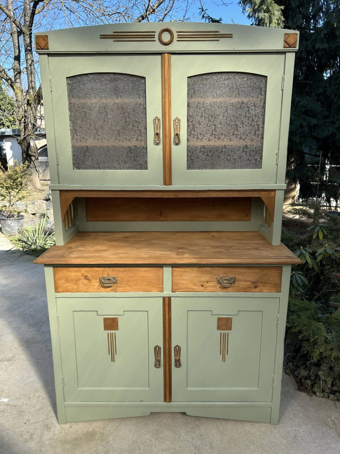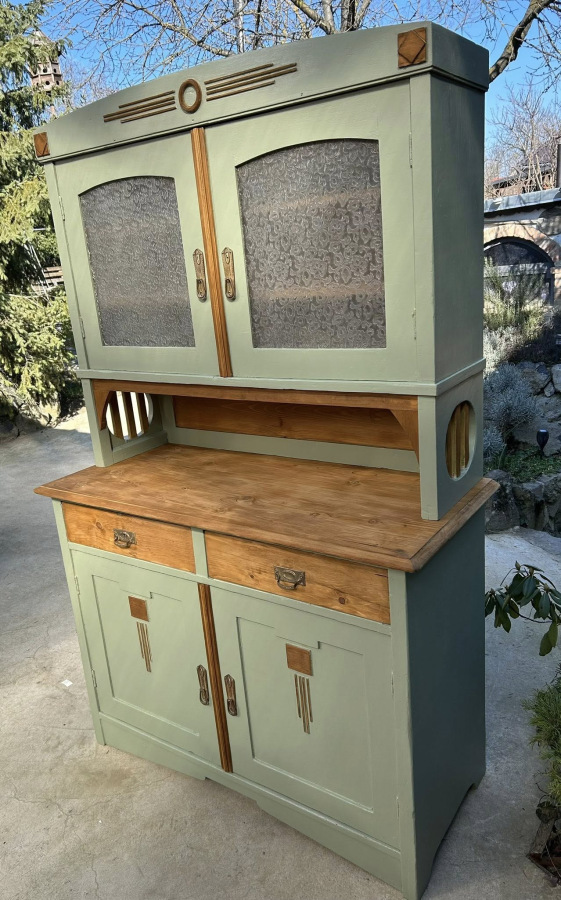 K96 - vidiecky starožitný kredenc, (1933), zrenovovaný a ošetrený proti škodcom, v upokojujúcej zelenej farbe v Toskánskom štýle. Kombinovaný s prírodným orechovým nádychom.