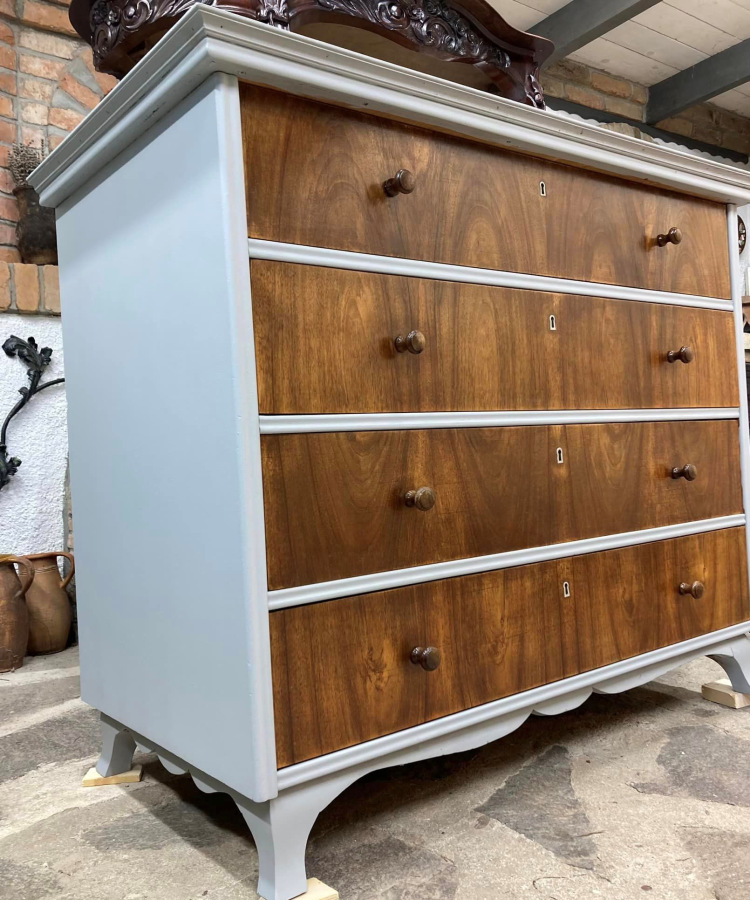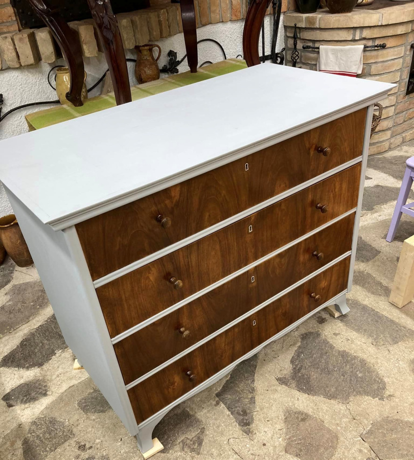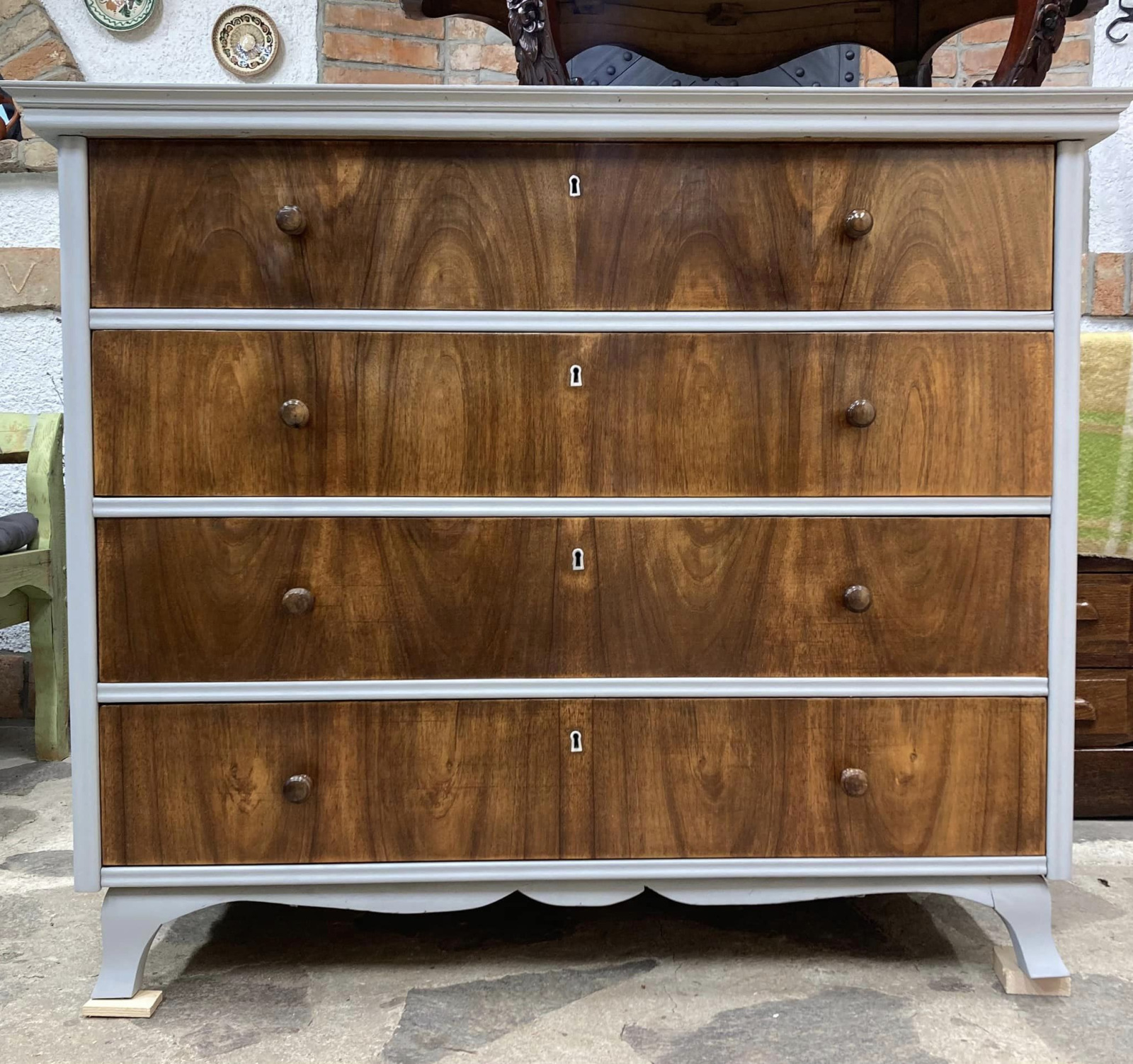 KOM07 - Vintage komoda v sivej farbe v zreštaurovanom stave. Cena 250€.