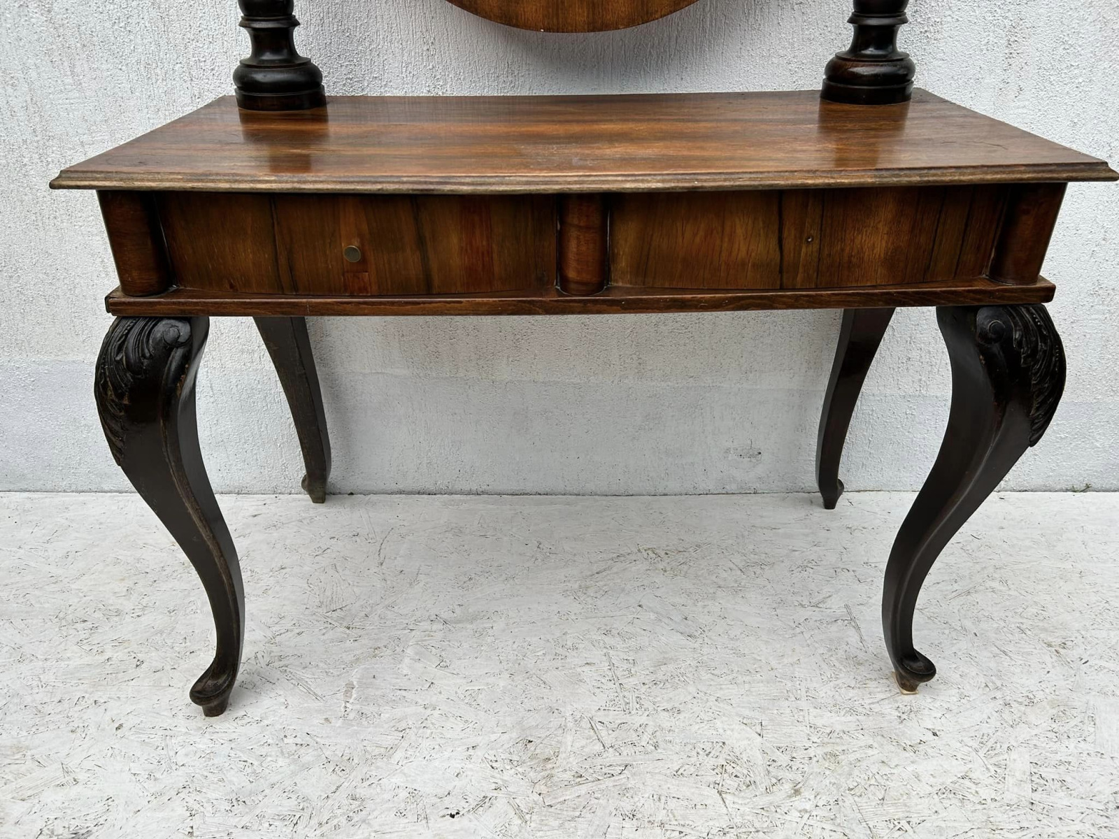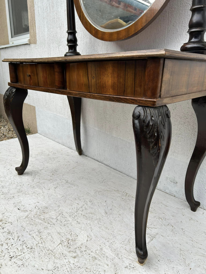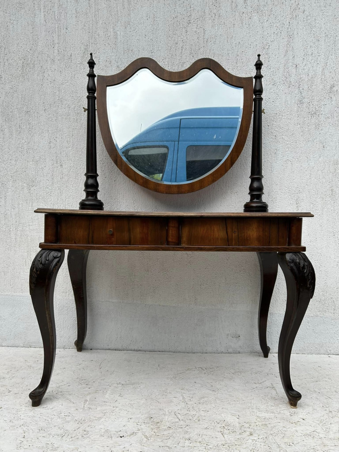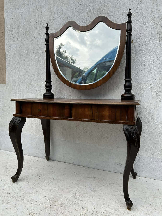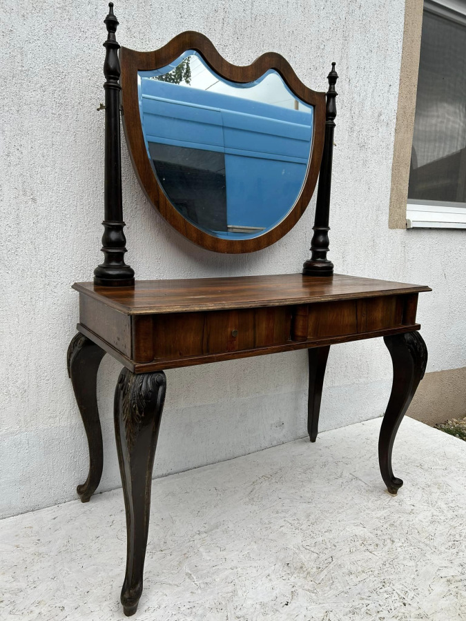 Konzolový toaletný stolík so zrkadlom, s orechovou dyhou. V bytovom stave!