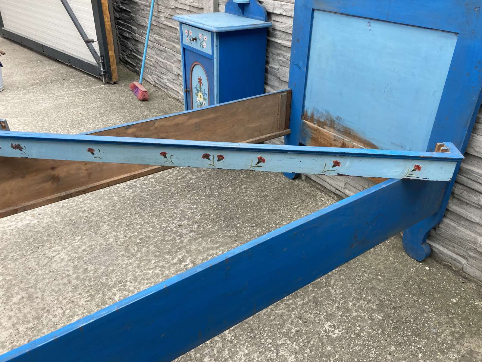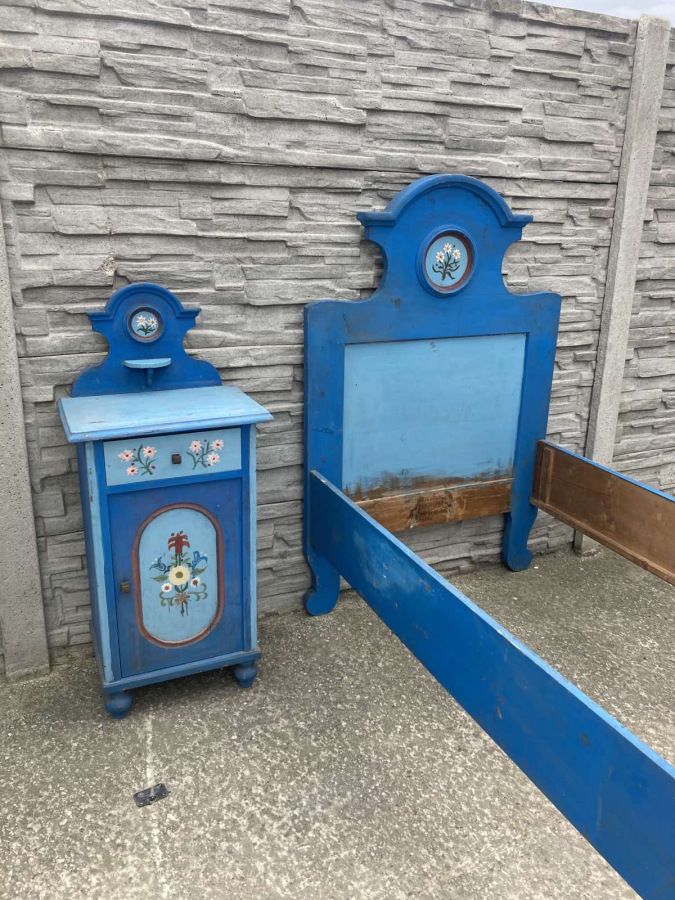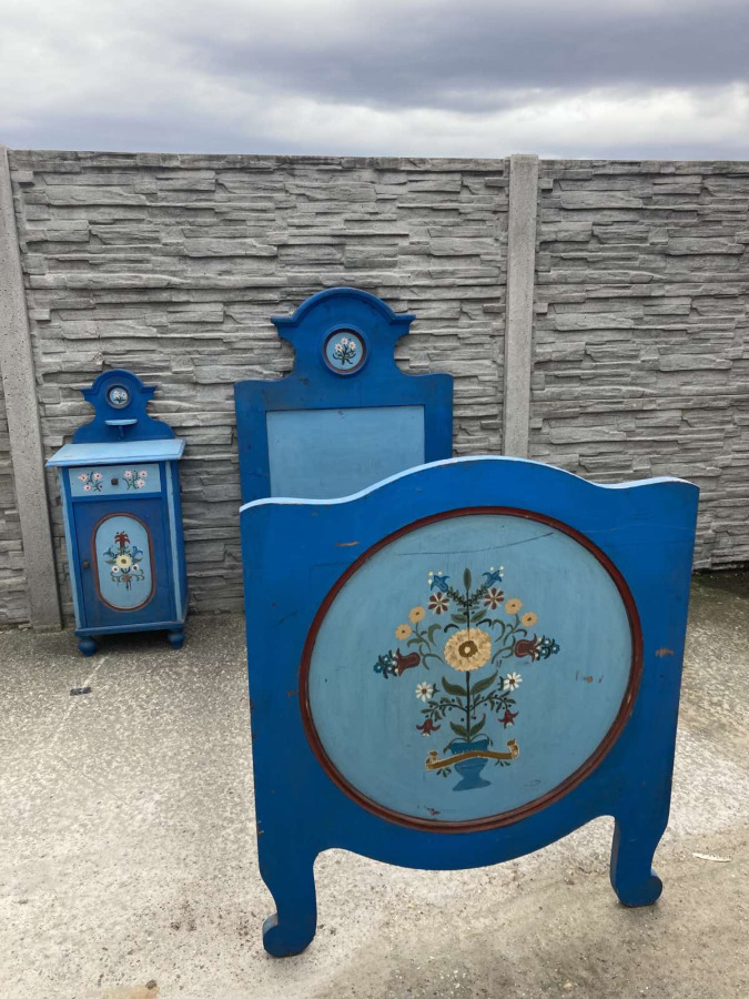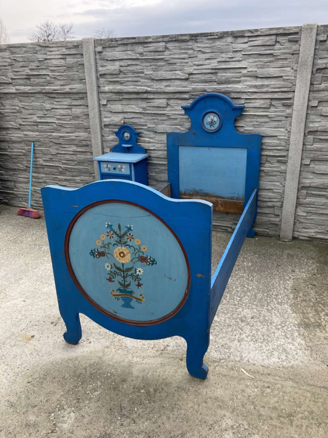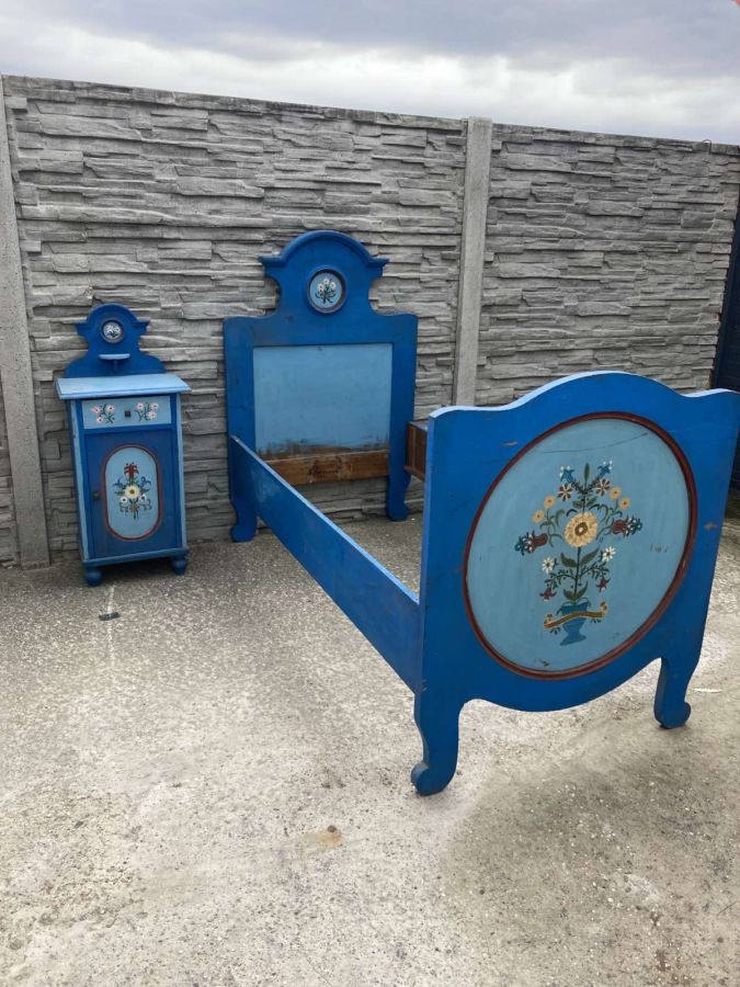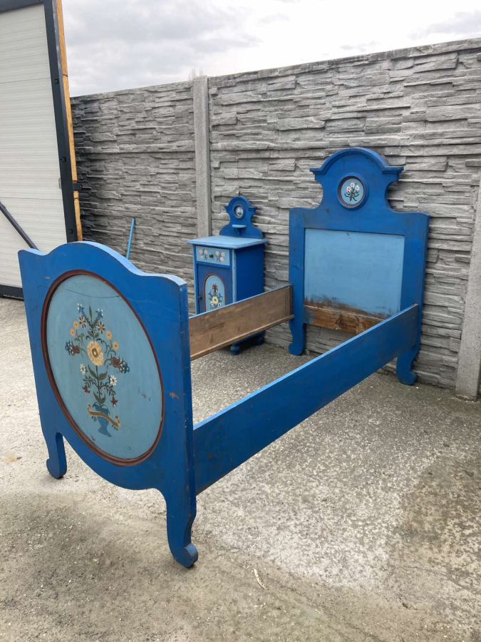 Krásna spálňa s ľudovým námetom (posteľ, nočný stolík, garniža) vhodná na chalupu, chatu.