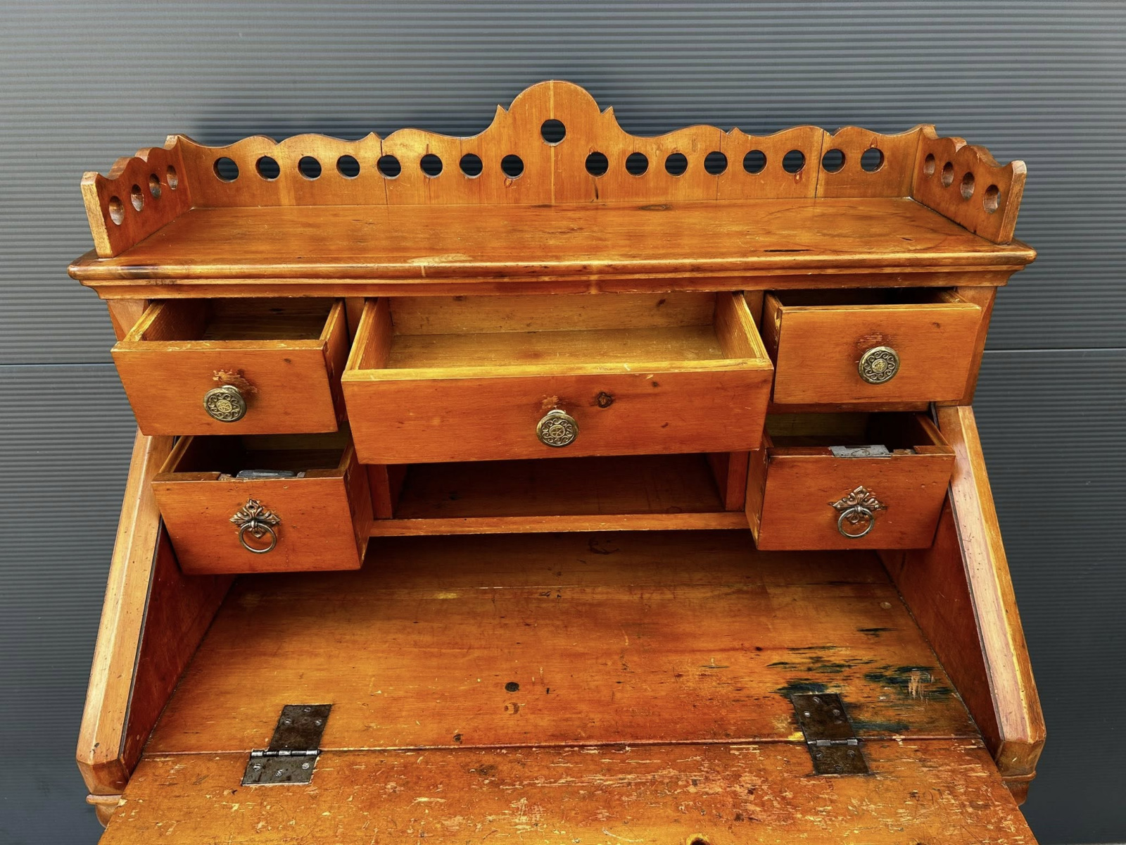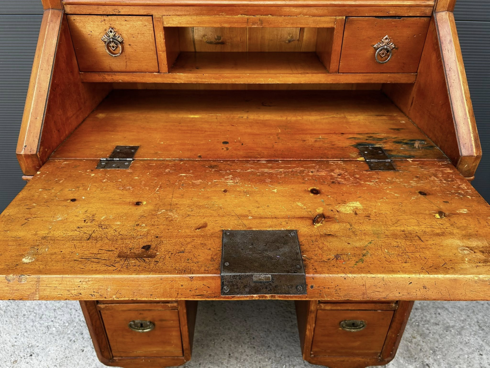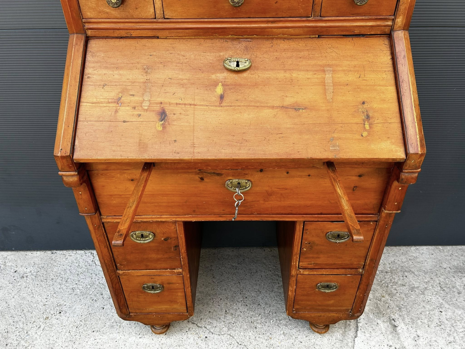 Písací kabinet z mákkého dreva v kombinácii s čerešňový drevom! Veľmi zriedkavý kus nábytku vyrobený v roku 1882, v Budapešti, v malej manufaktúre mladými tovarišmi a účňami! Nábytok je v perfektnom bytovom stave s pôvodnou povrchovou úpravou a svojou okúzľujúcou patinou!!! Zberateľský kus!!!