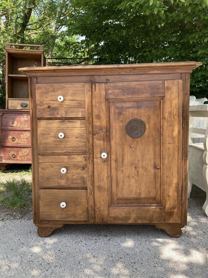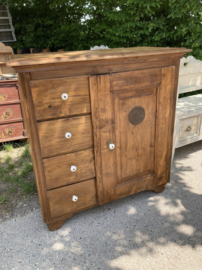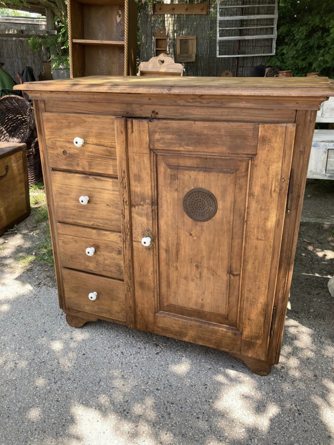 PS07 - Dobová potravinová skrinka / chlebník v zreštaurovanom stave (bytový stav), zámerne zachovalé známky staroby, Povrchová úprava včelí vosk. Dizajnový prvok.