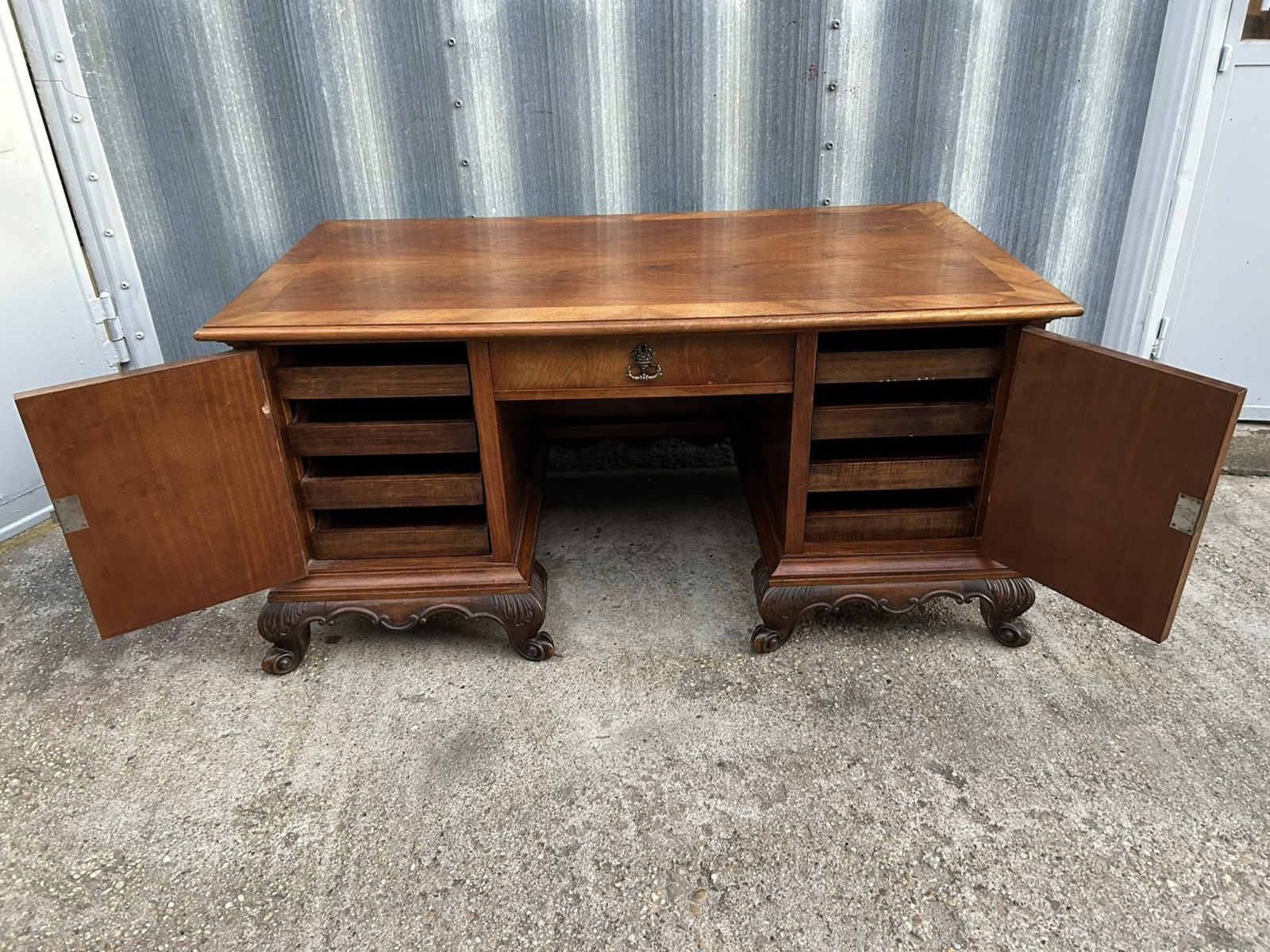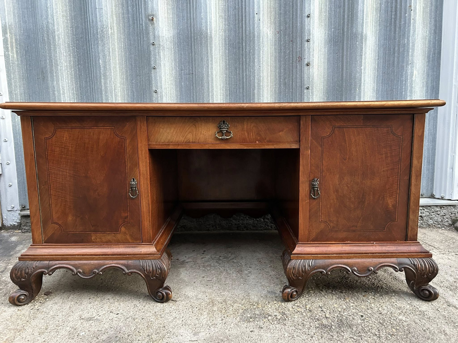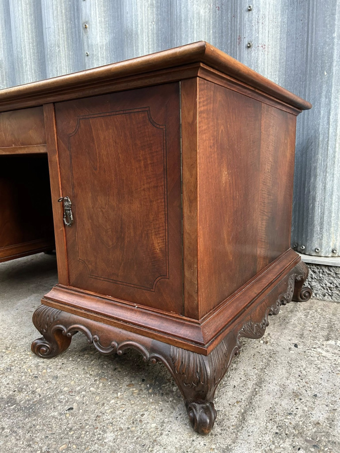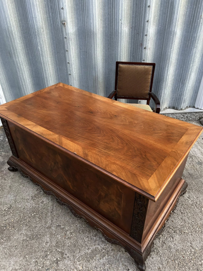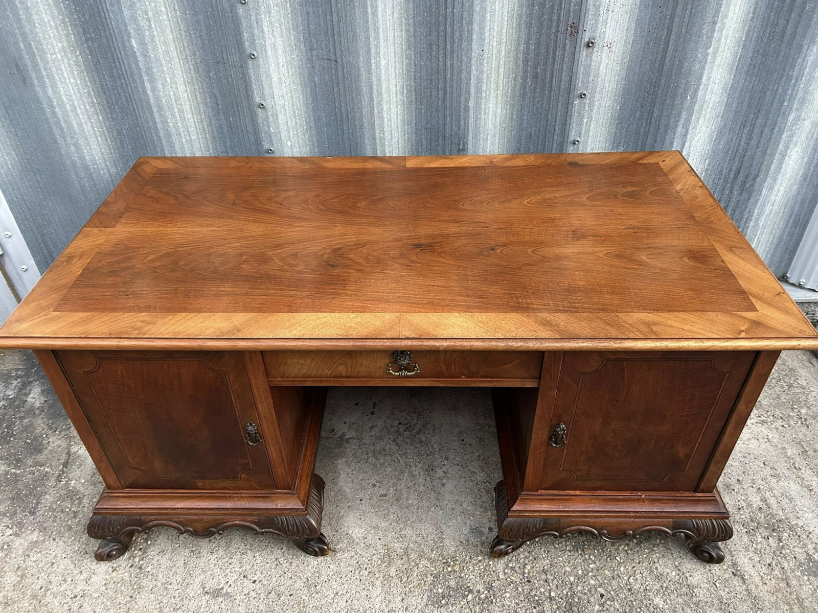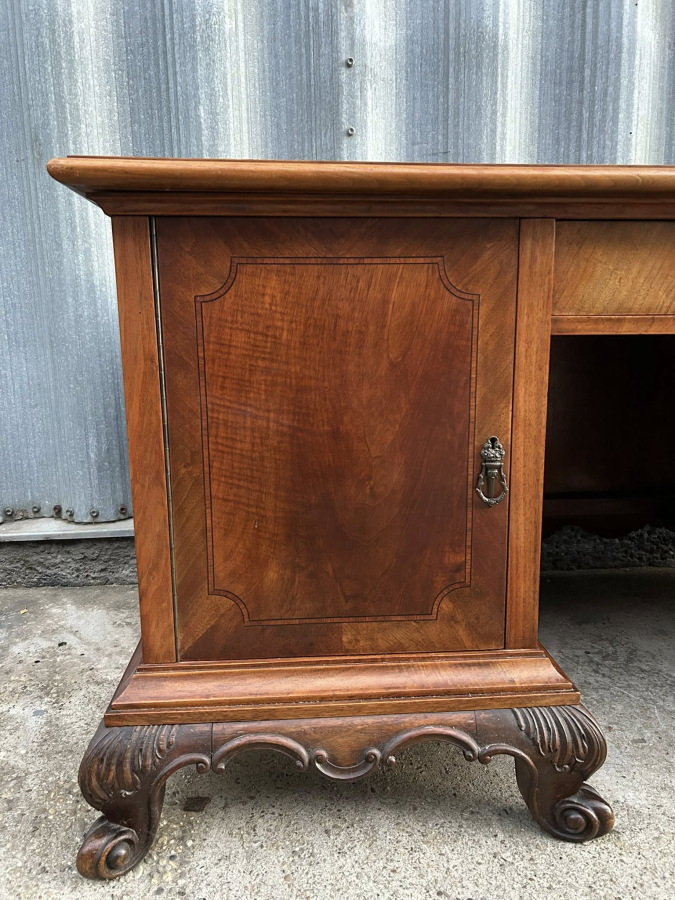 Reprezentačný Písaci stôl z obdobia prvej republiky, v neobarokovom štýle v bezchybnom stave s peknou historickou patinou. Vhodný do reprezentačných priestorov kvôli svojej veľkosti (šírka - 170 cm, hĺbka - 92 cm). Je k nemu aj veľké pohodlné zrenovované kreslo!!! Stôl je priestorový. S peknou orechovou dyhou a vkladanou intarziou !!!