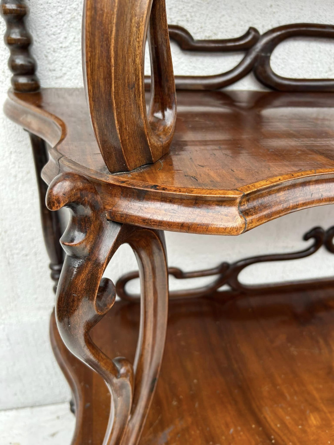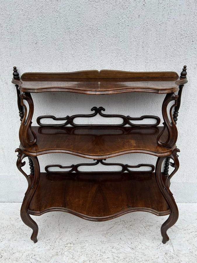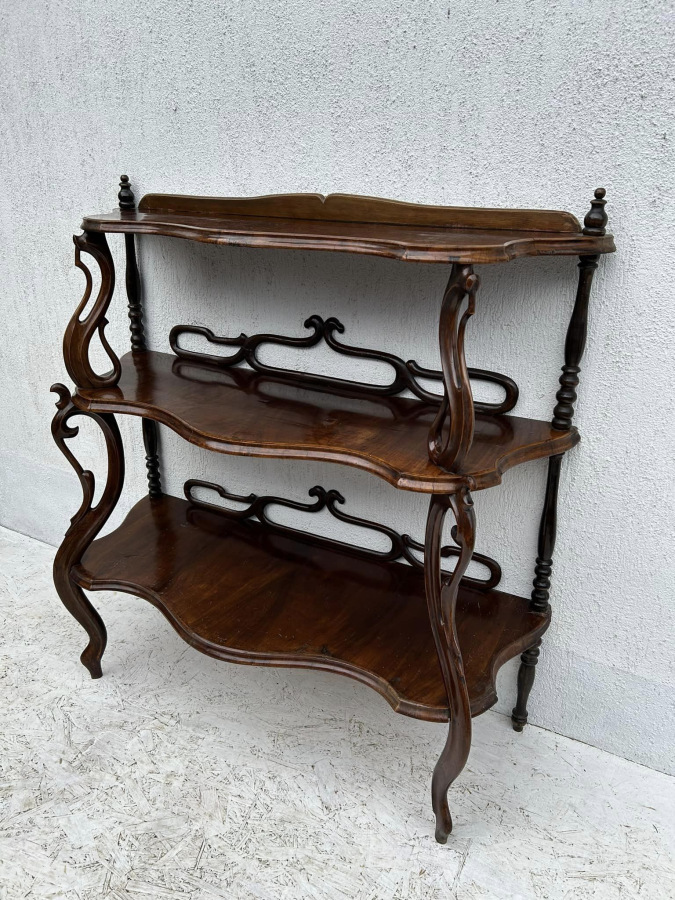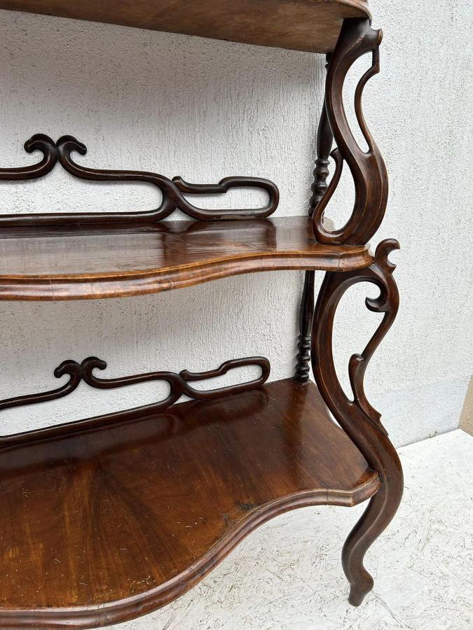 Rokokový etažer (polica) s dyhou z orecha s tradičnou polytúrou. Bytový stav, krásna zachovalá povrchová úprava! Dobový zberateľský kus!!!