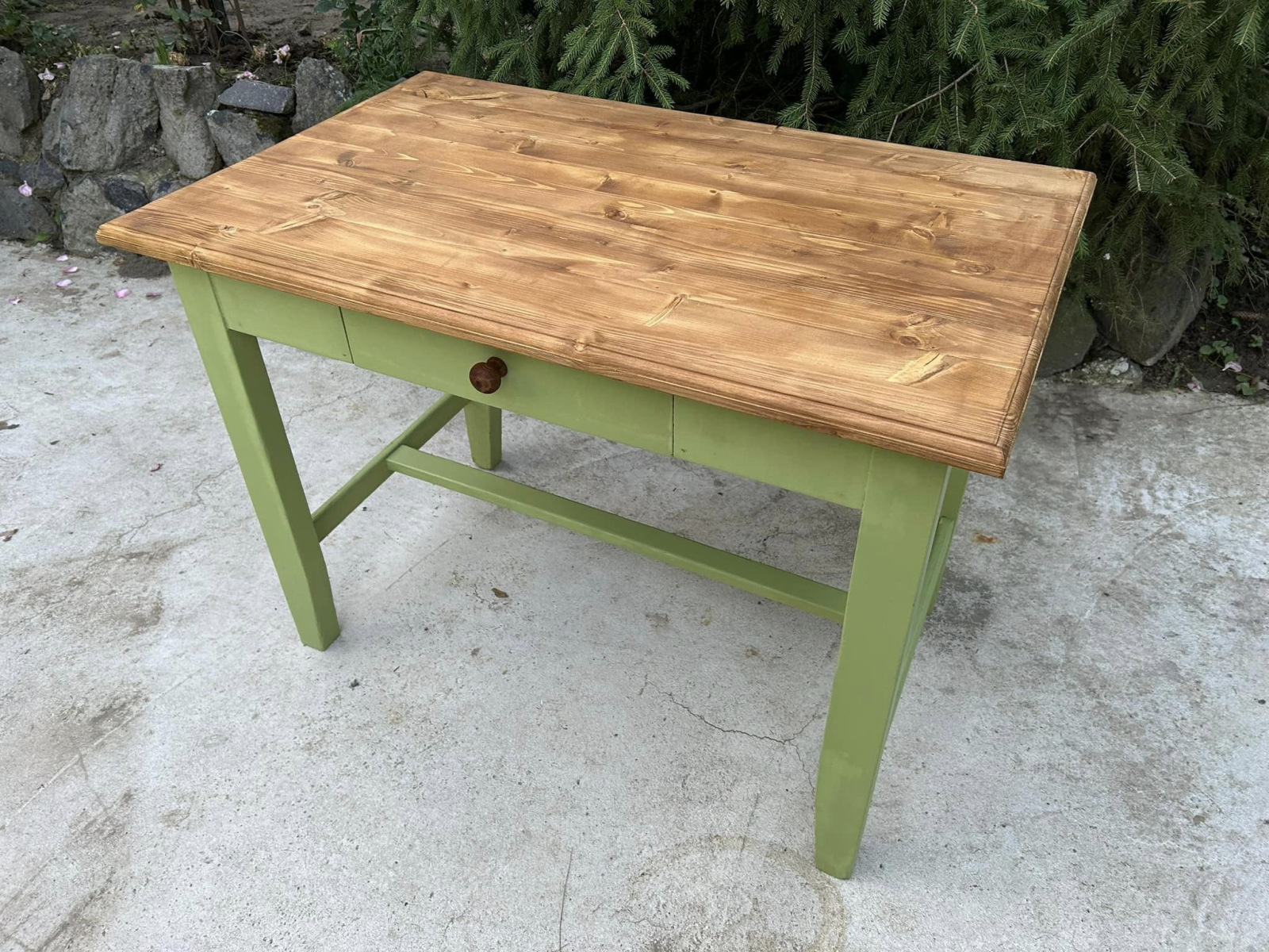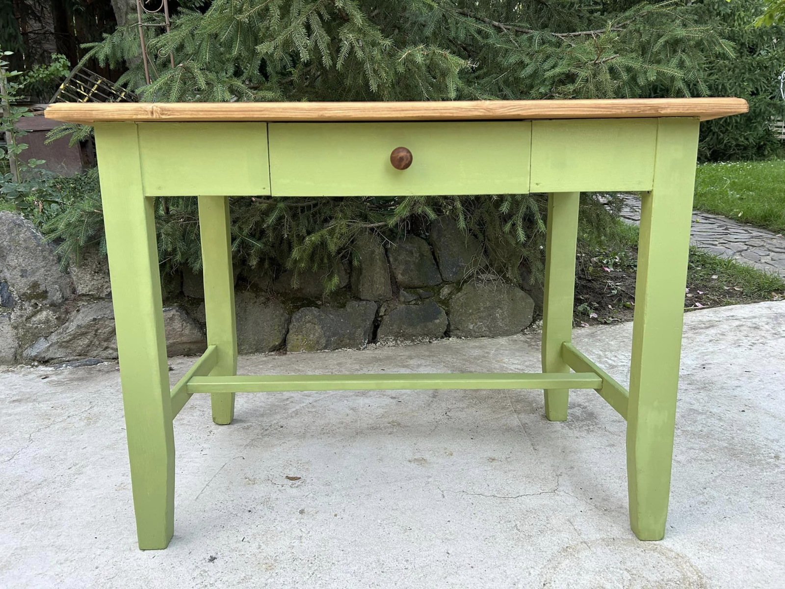 ST30 - Vintage stôl v zelenej farbe s plátom v prírodnej farbe.