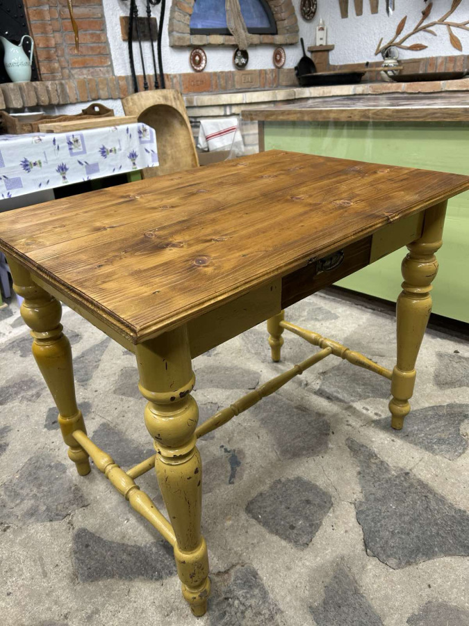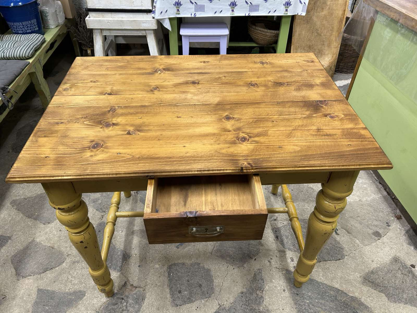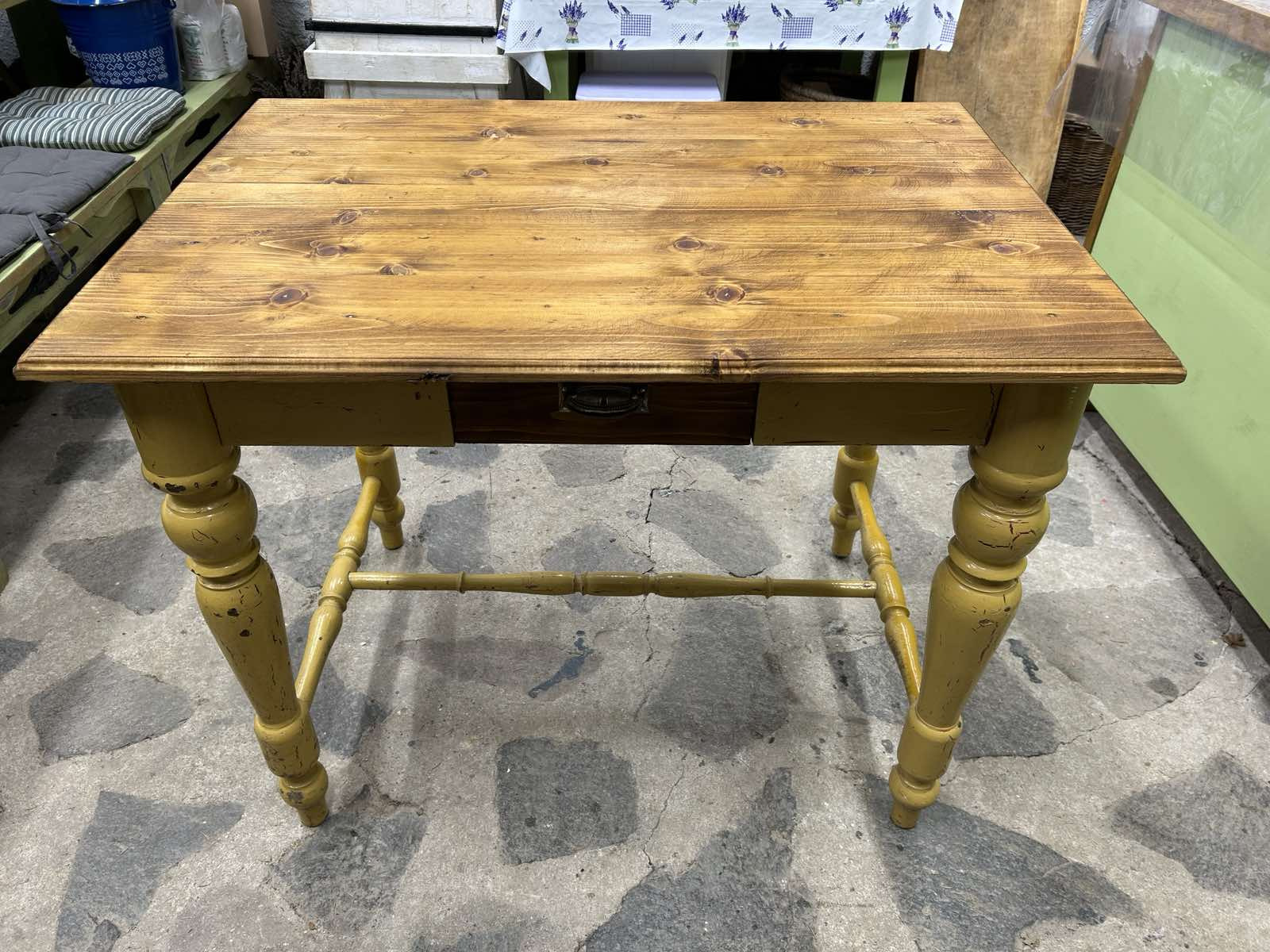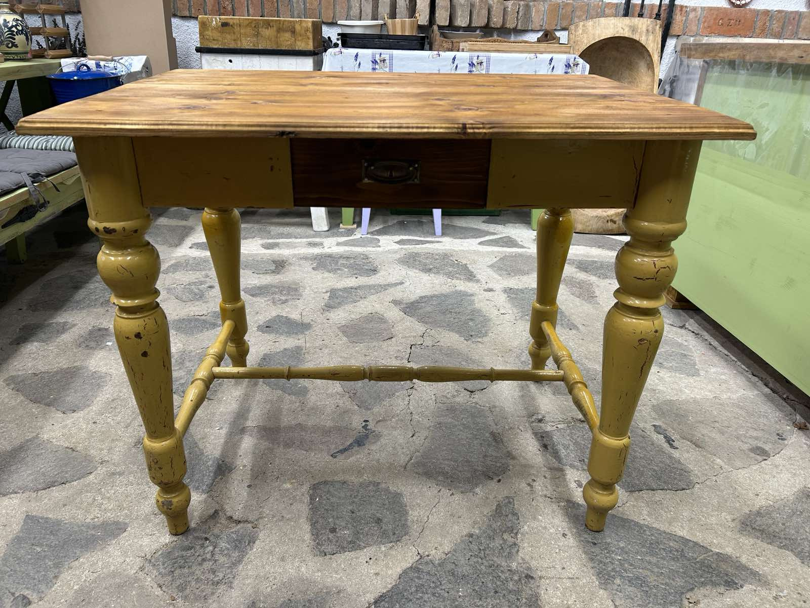 ST36 - Kuchynský / pracovný alebo písací stôl, zrenovovaný do vintage štýlu. Pevný, masívny bez škodcov!!! Horný plát je namorený orechovým moridlom a s patinou! Ihneď k odberu.