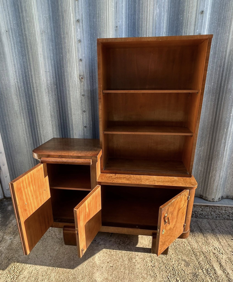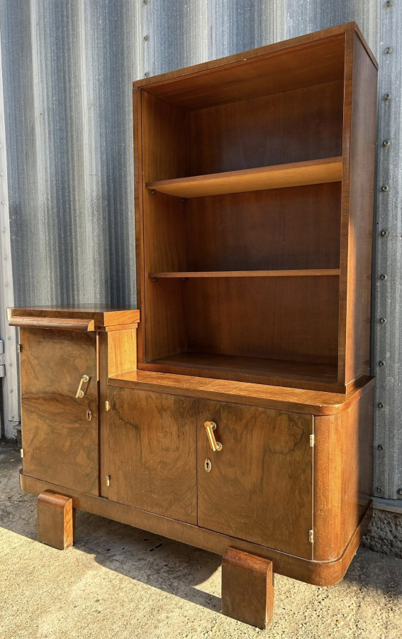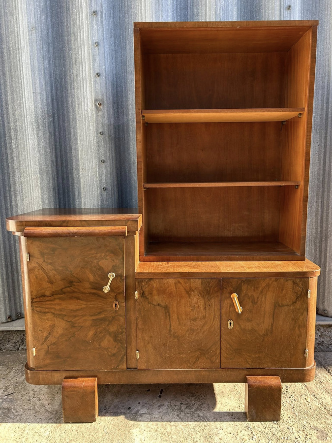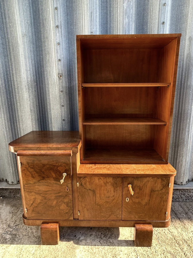 V63 - Art DECO bufet / príborník v peknom bytovom stave s pôvodnými odťahovacími sklami s vyťahovacou pracovnou doskou. Zriedkavý druh príborníka s krásnou orechovou dýhou!!!