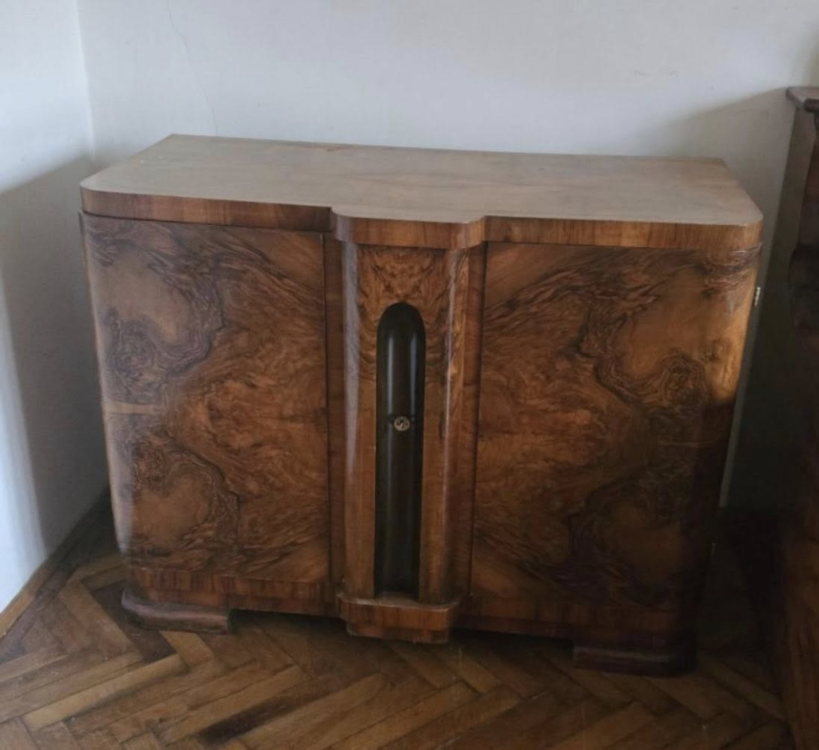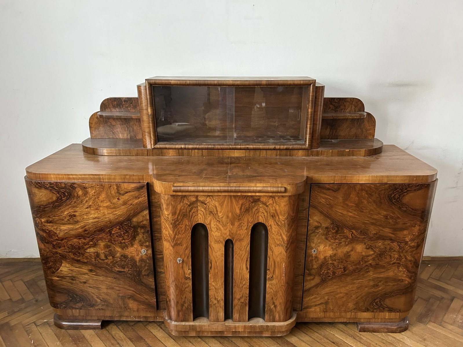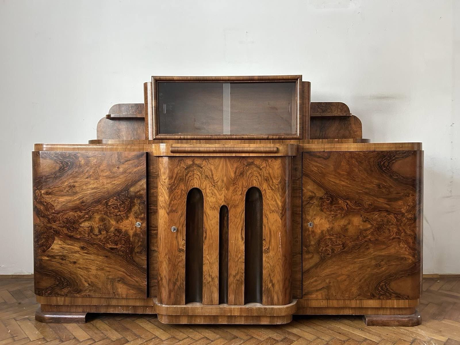 V67 -Art DECO obývačka! Krásna zostava/set pozostávajúci z veľkého, malého príborníka a vitríny. Všetko v bezchybnom bytovom stave. Korenicová dýha na celom obvode nábytku. Nábytok bol zrenovovaný pred 10 rokmi so šelakovou politúrou! Nábytok bol vyrobený na objednávku v roku 1936 v Debrecen. Ihneď k odberu len spolu!!!