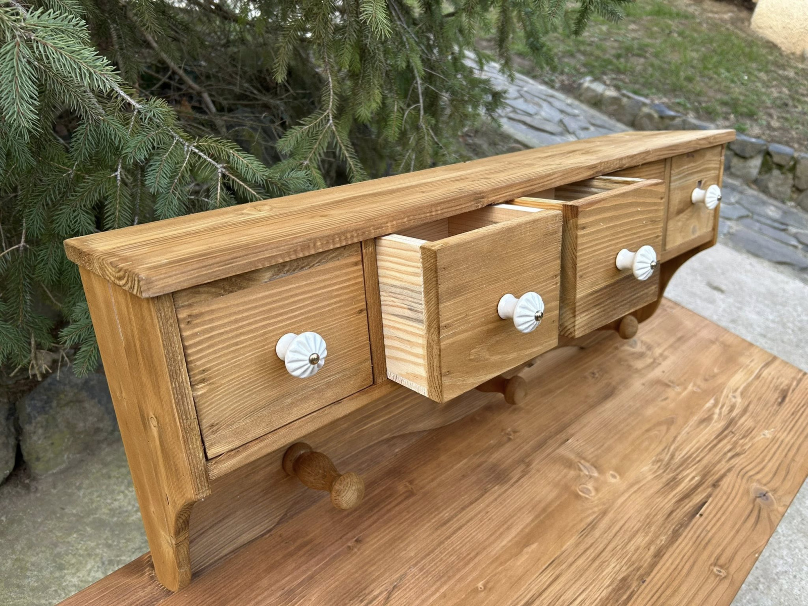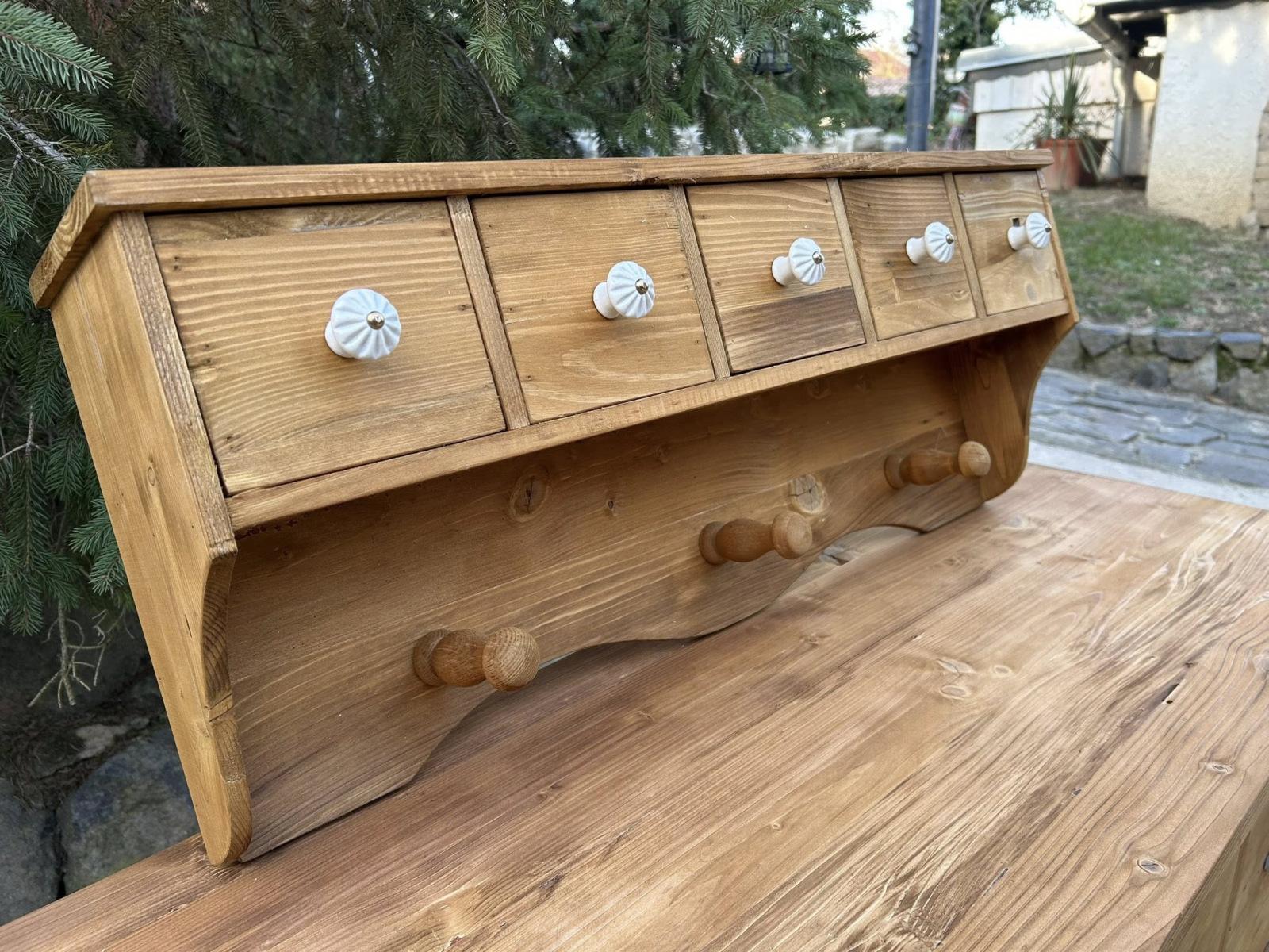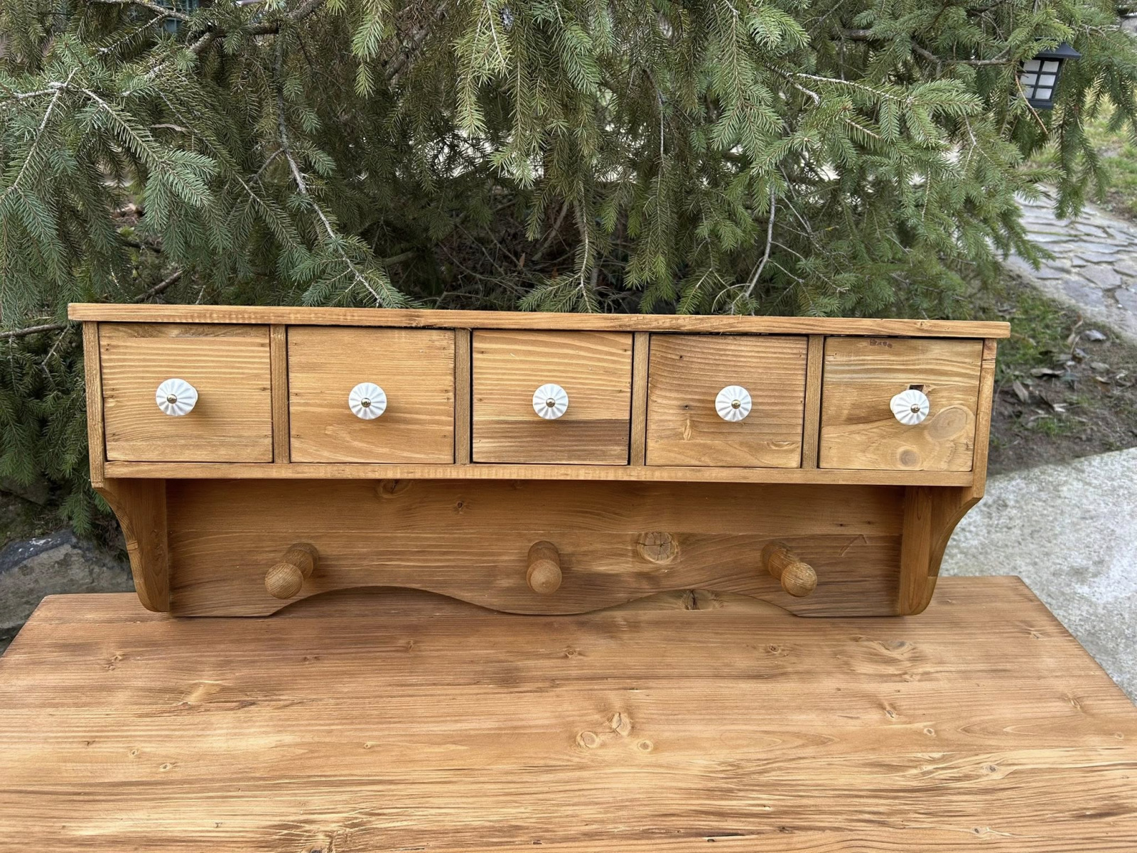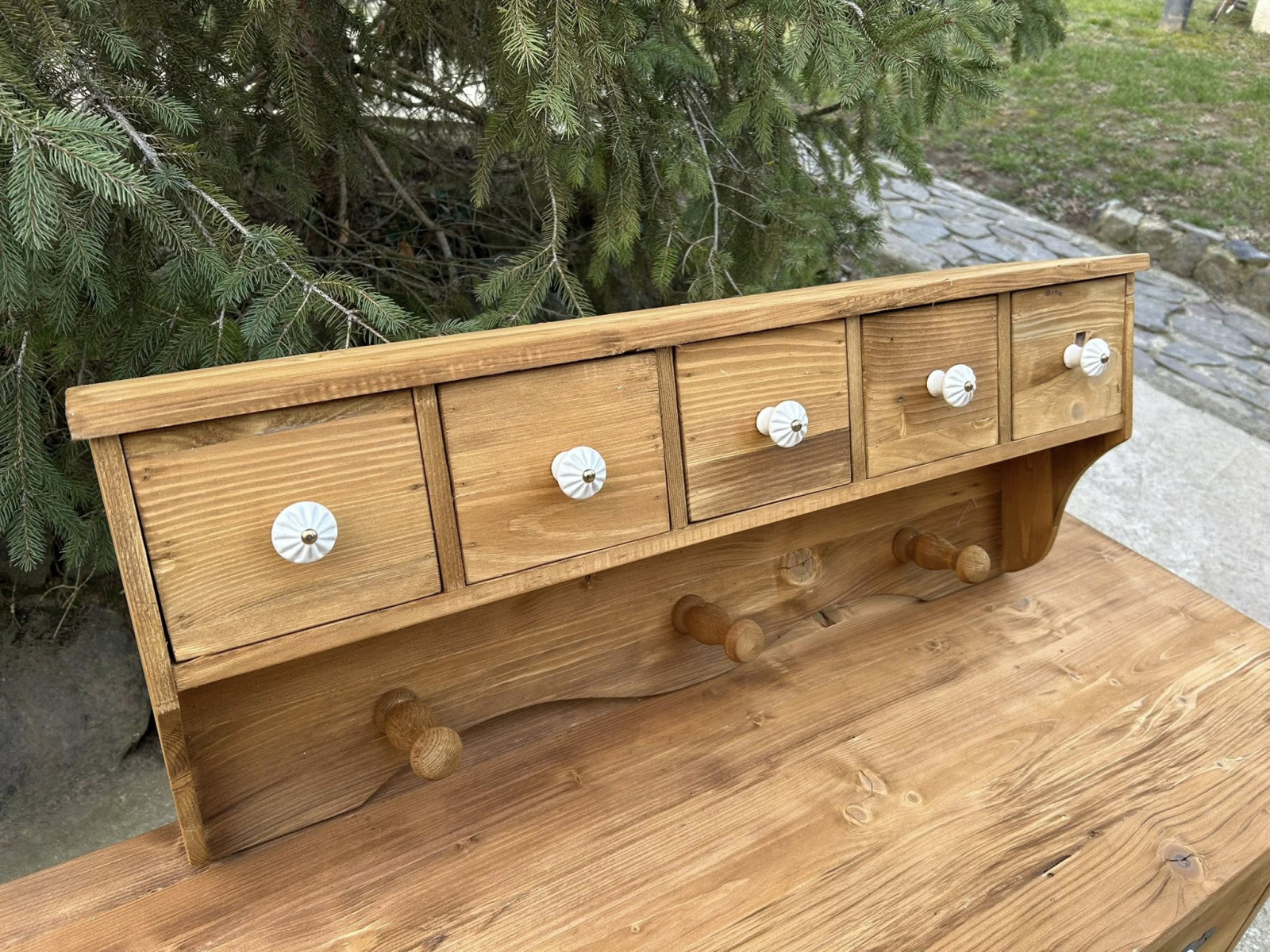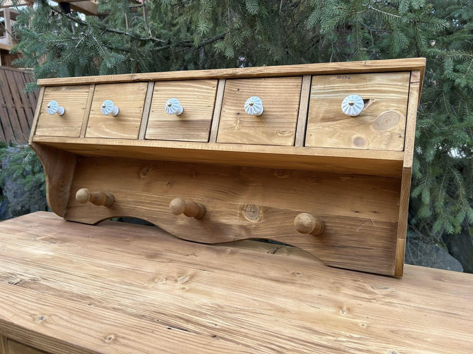 VES08 - Korenička/polička s vešiakom Vintage vhodná na stenu. Zrenovovaná! Vyrobená na novo zo starého dreva!